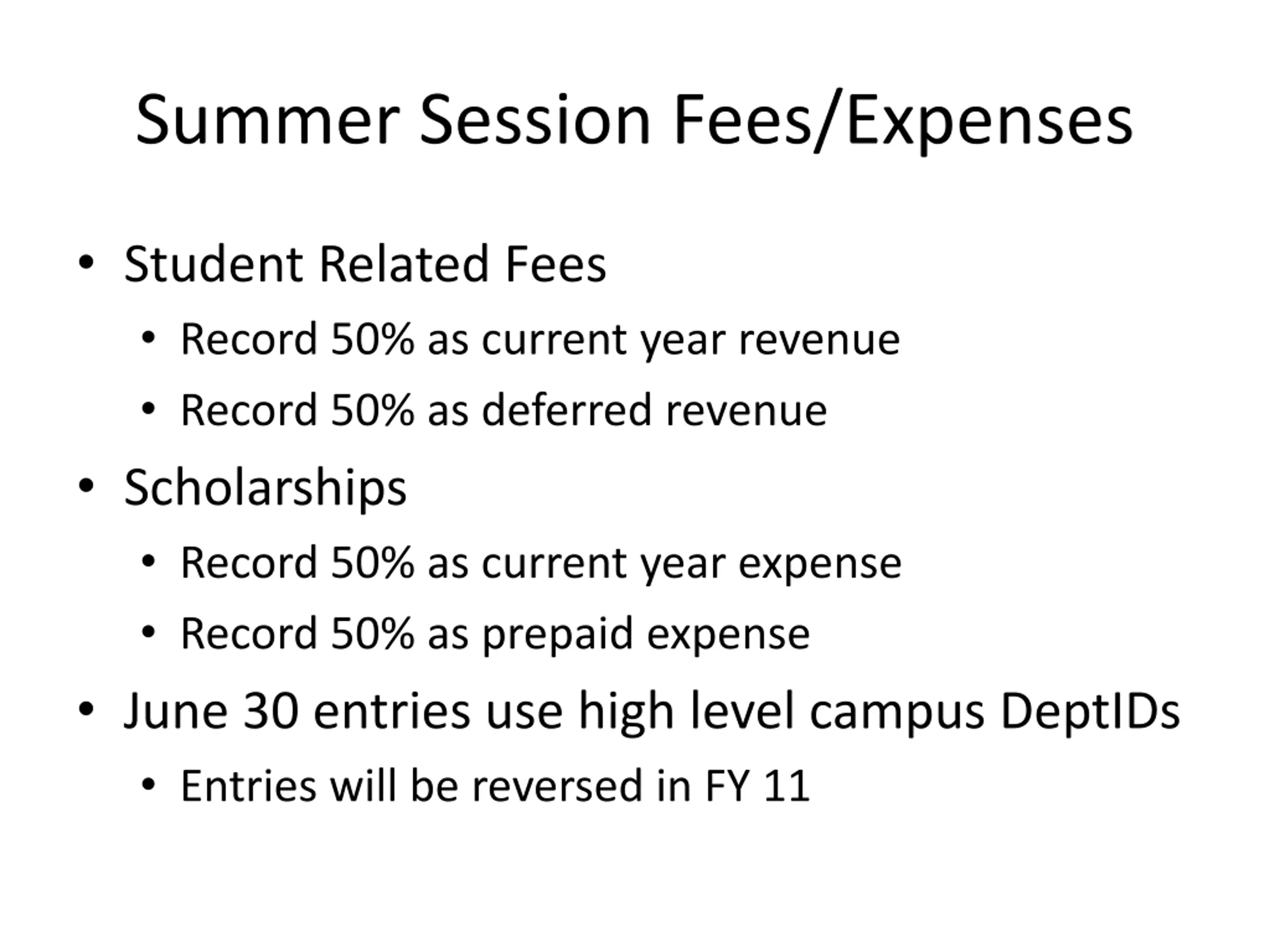 Summer Session Fees/Expenses Student Related Fees Record 50% as current year revenue Record 50% as deferred revenue Scholarships Record 50% as current year expense Record 50% as prepaid expense June 30 entries use high level campus DeptIDs Entries will be reversed in FY 11