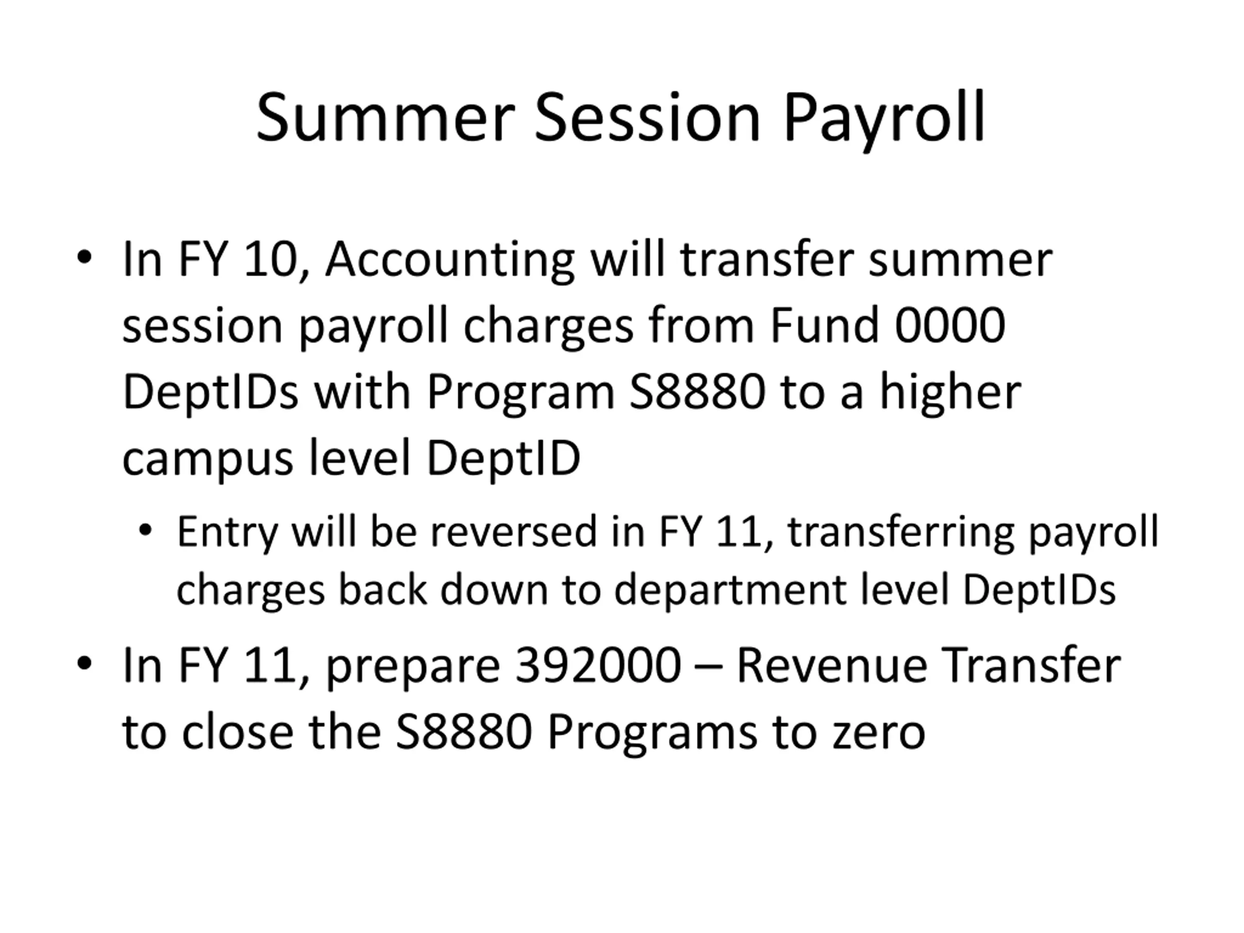 Summer Session Payroll In FY 10, Accounting will transfer summer session payroll charges from Fund 0000 DeptIDs with Program S8880 to a higher campus level DeptID Entry will be reversed in FY 11, transferring payroll charges back down to department level DeptIDs In FY 11, prepare 392000 Revenue Transfer to close the S8880 Programs to zero