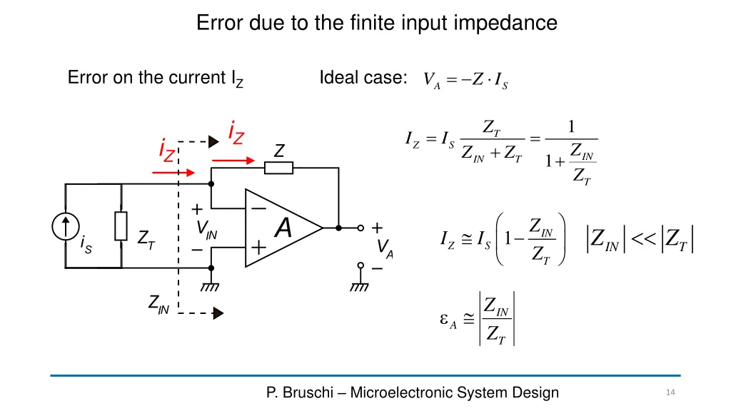 Error on the output voltage Ideal case: = V Z I This voltage is affected only by the error due to: A S I I S Z = V ina Z A I Z ina iZ V A = = V v I Z I Z A A in Z Z 1 A I Z = 1 V I Z Z 1 A A Z + 1 Two error contributions P. Bruschi Microelectronic System Design 15