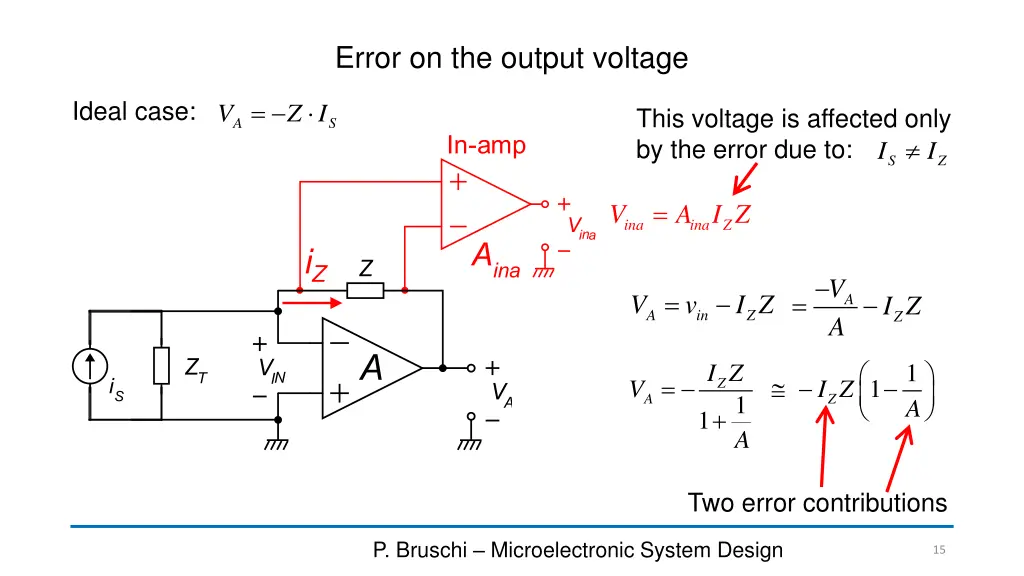 Error due to the finite input impedance Error on the current IZ Ideal case: = V Z I A S iZ 1 Z Z Z = = I I T iZ Z S + Z Z + 1 IN IN T T Z Z Z Z 1 IN I I IN T Z S T Z IN A Z T P. Bruschi Microelectronic System Design 14