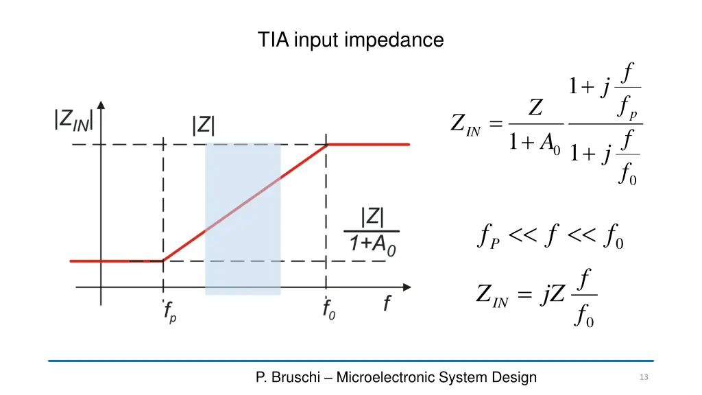 TIA: input impedance ZIN f + 1 j f Z p = Z IN f + 1 A + 01 j f 0 ( ) + 1 f A f A f 0 0 0 p p f0 is defined as the frequency at which the amplifier gain magnitude is unity (0 dB) P. Bruschi Microelectronic System Design 12