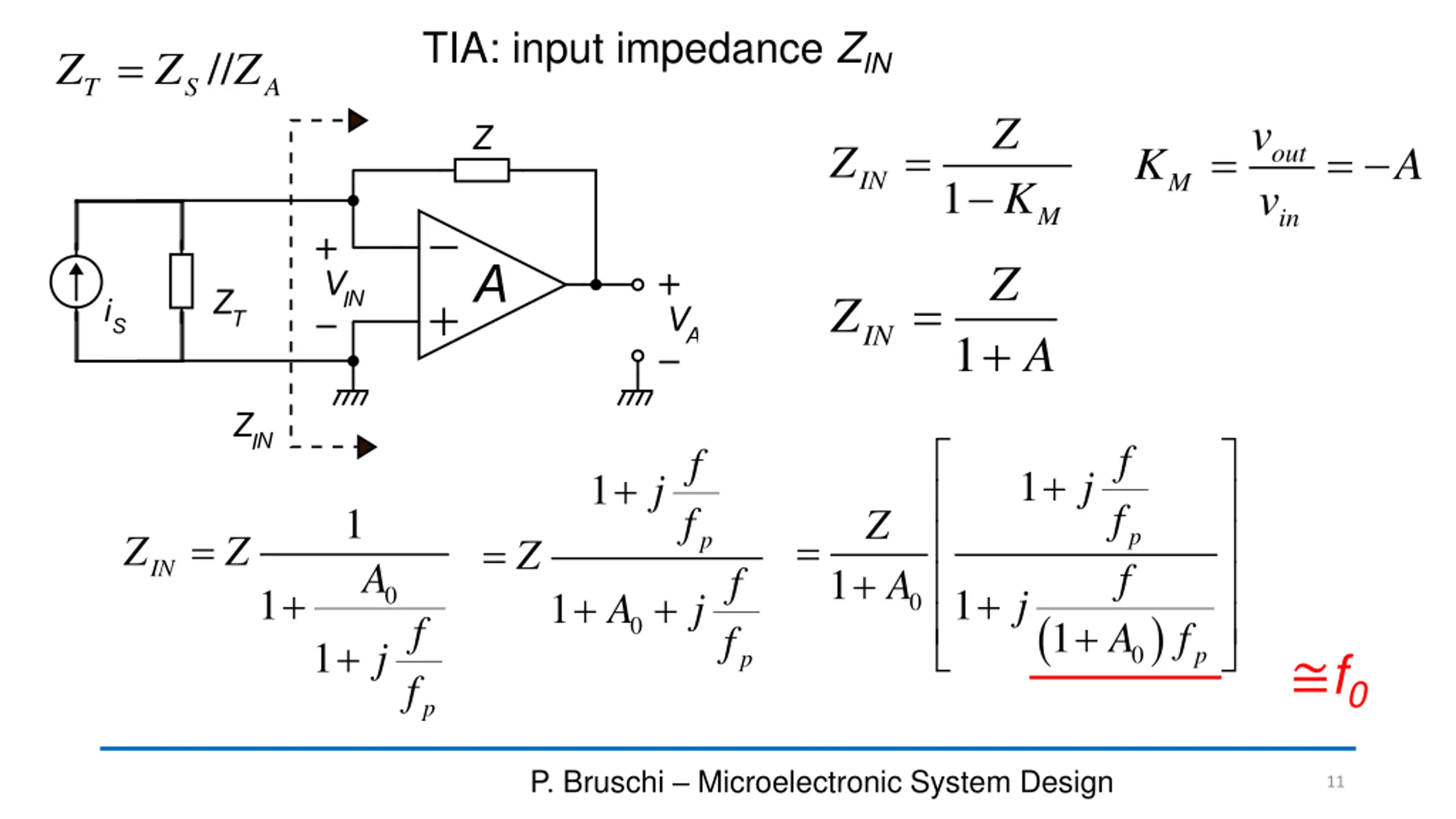 TIA: input impedance ZIN = // Z Z Z T S A Z K v = = = Z out v K A IN M 1 M in Z + = Z IN 1 A f f + + 1 jf 1 jf 1 Z p = = p = Z Z Z IN A f + f 1 A + + + + 1 1 j 0 1 A jf 0 ( ) f + 0 1 A f + 1 jf 0 p f0 p p P. Bruschi Microelectronic System Design 11