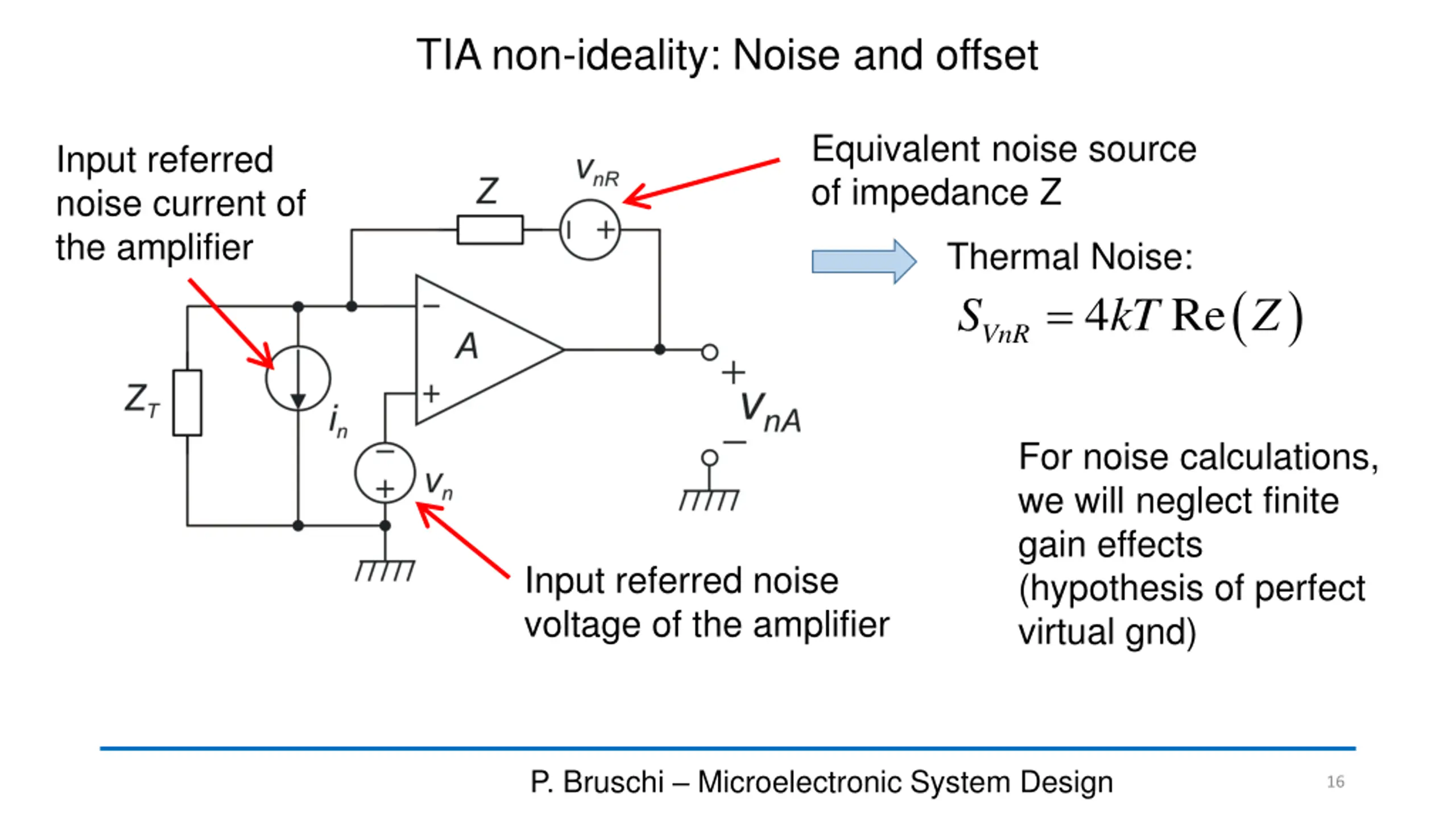 TIA non-ideality: Noise and offset Equivalent noise source of impedance Z Input referred noise current of the amplifier Thermal Noise: S = ( ) Z 4 Re kT VnR For noise calculations, we will neglect finite gain effects (hypothesis of perfect virtual gnd) Input referred noise voltage of the amplifier P. Bruschi Microelectronic System Design 16