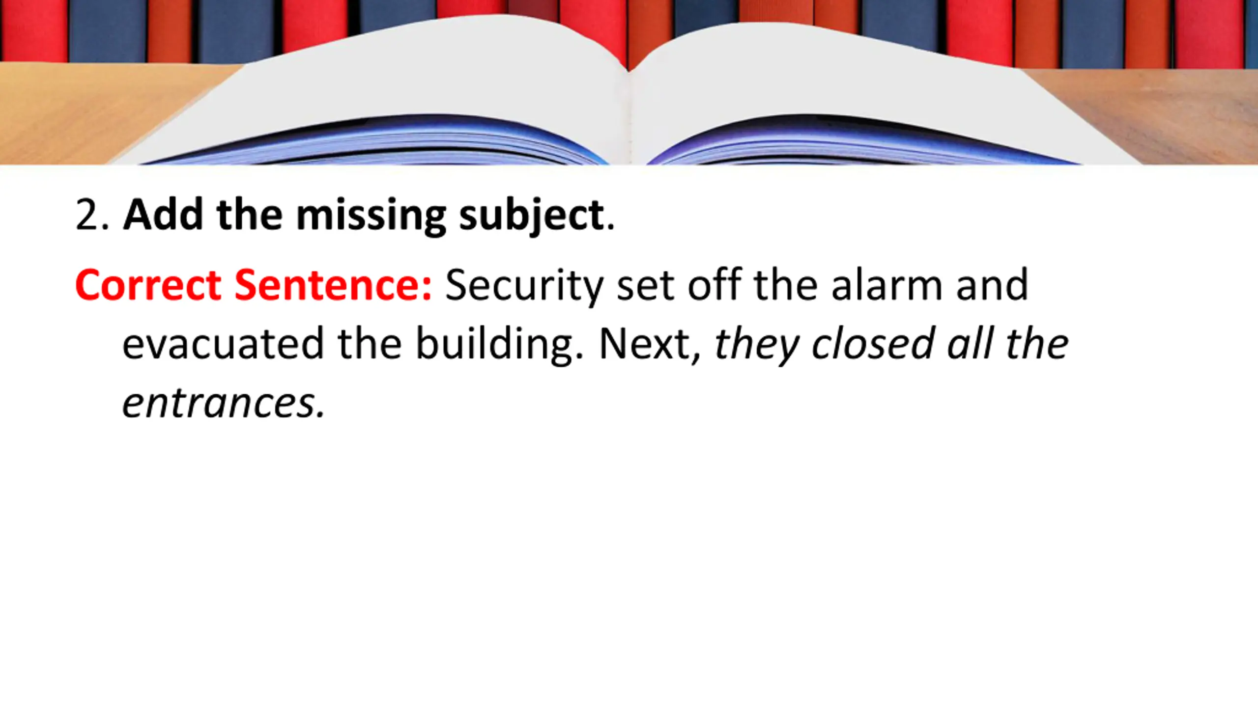 2. Add the missing subject. Correct Sentence: Security set off the alarm and evacuated the building. Next, they closed all the entrances.