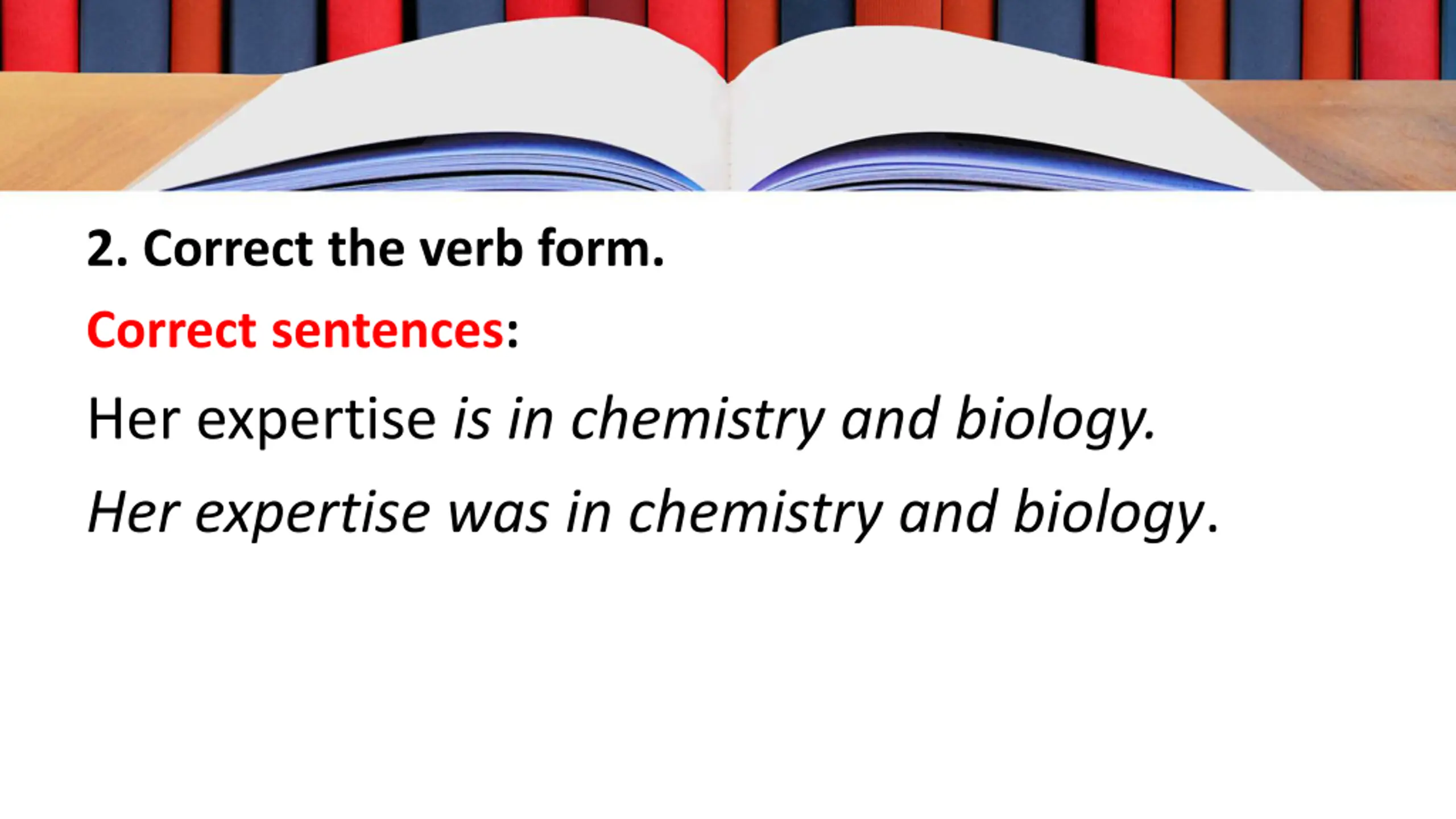 2. Correct the verb form. Correct sentences: Her expertise is in chemistry and biology. Her expertise was in chemistry and biology.
