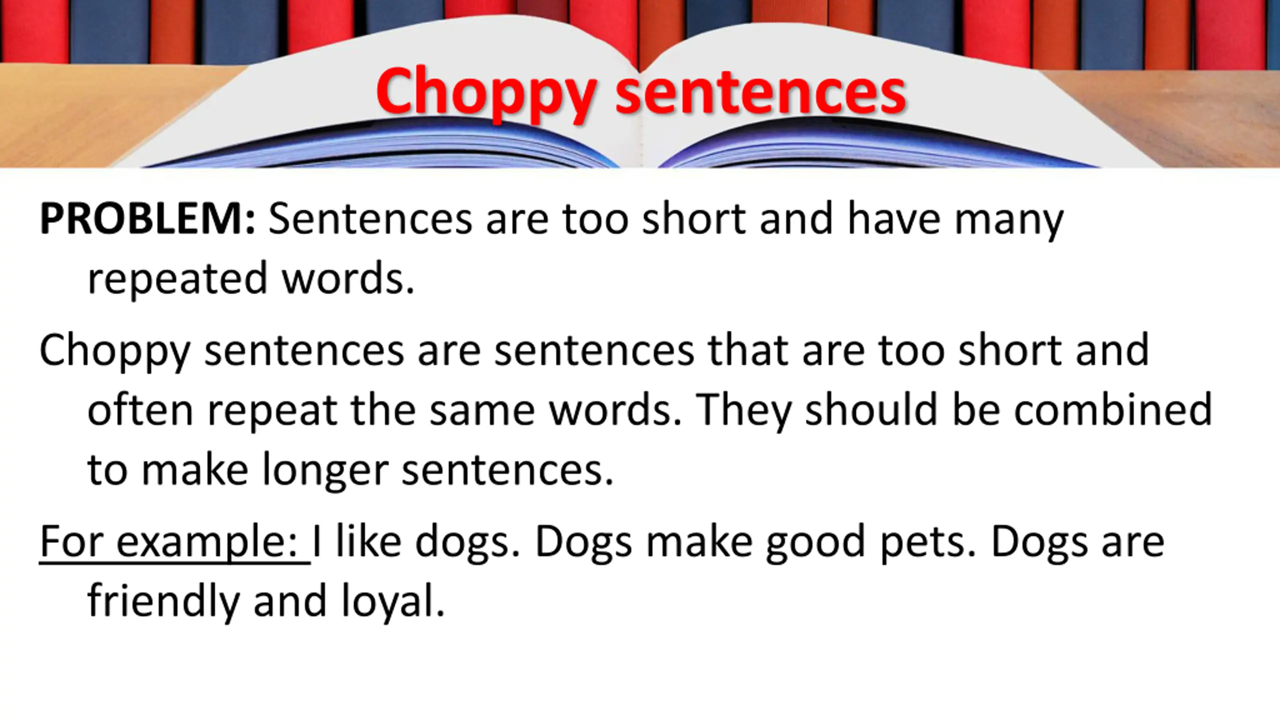 Choppy sentences PROBLEM: Sentences are too short and have many repeated words. Choppy sentences are sentences that are too short and often repeat the same words. They should be combined to make longer sentences. For example: I like dogs. Dogs make good pets. Dogs are friendly and loyal.