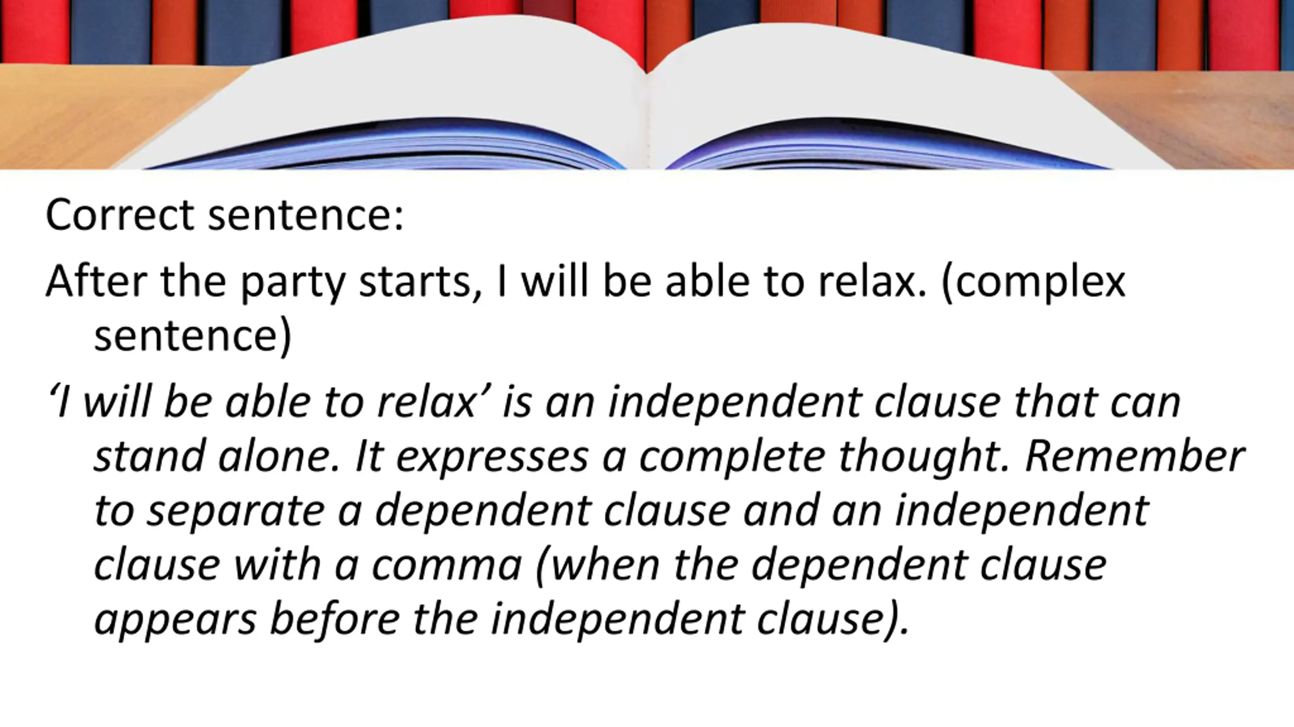 Correct sentence: After the party starts, I will be able to relax. (complex sentence) I will be able to relax is an independent clause that can stand alone. It expresses a complete thought. Remember to separate a dependent clause and an independent clause with a comma (when the dependent clause appears before the independent clause).