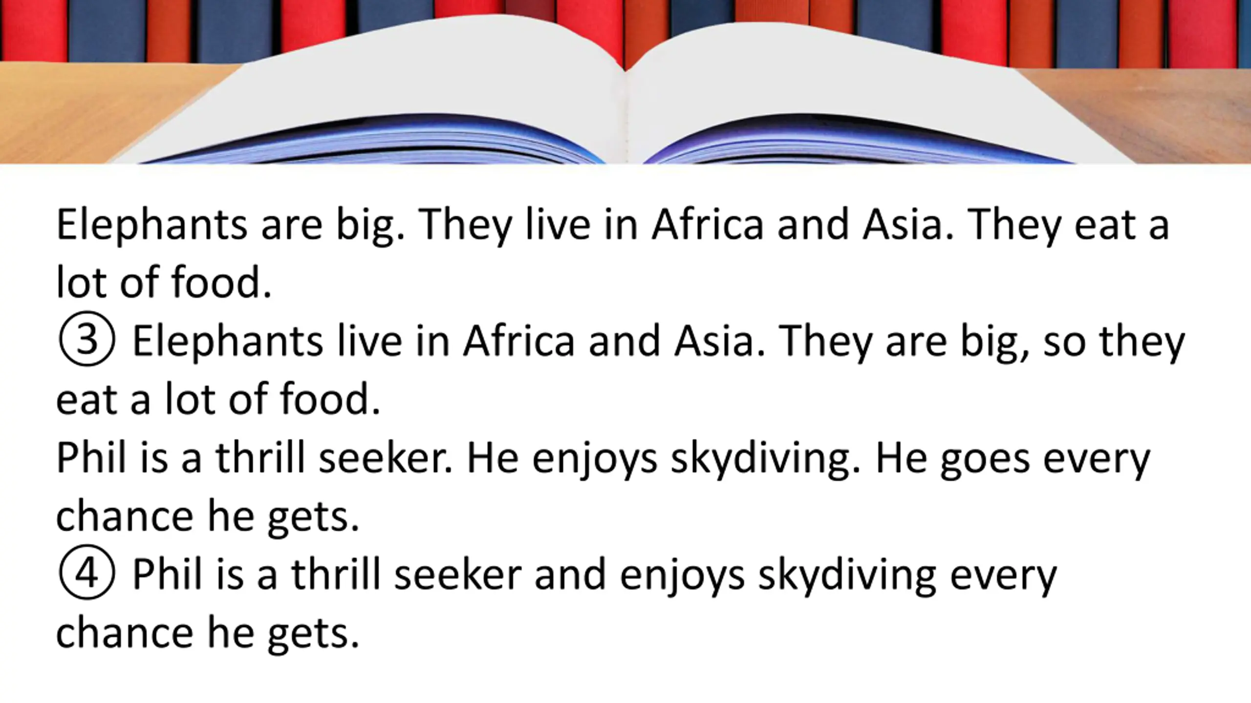 Elephants are big. They live in Africa and Asia. They eat a lot of food. Elephants live in Africa and Asia. They are big, so they eat a lot of food. Phil is a thrill seeker. He enjoys skydiving. He goes every chance he gets. Phil is a thrill seeker and enjoys skydiving every chance he gets.