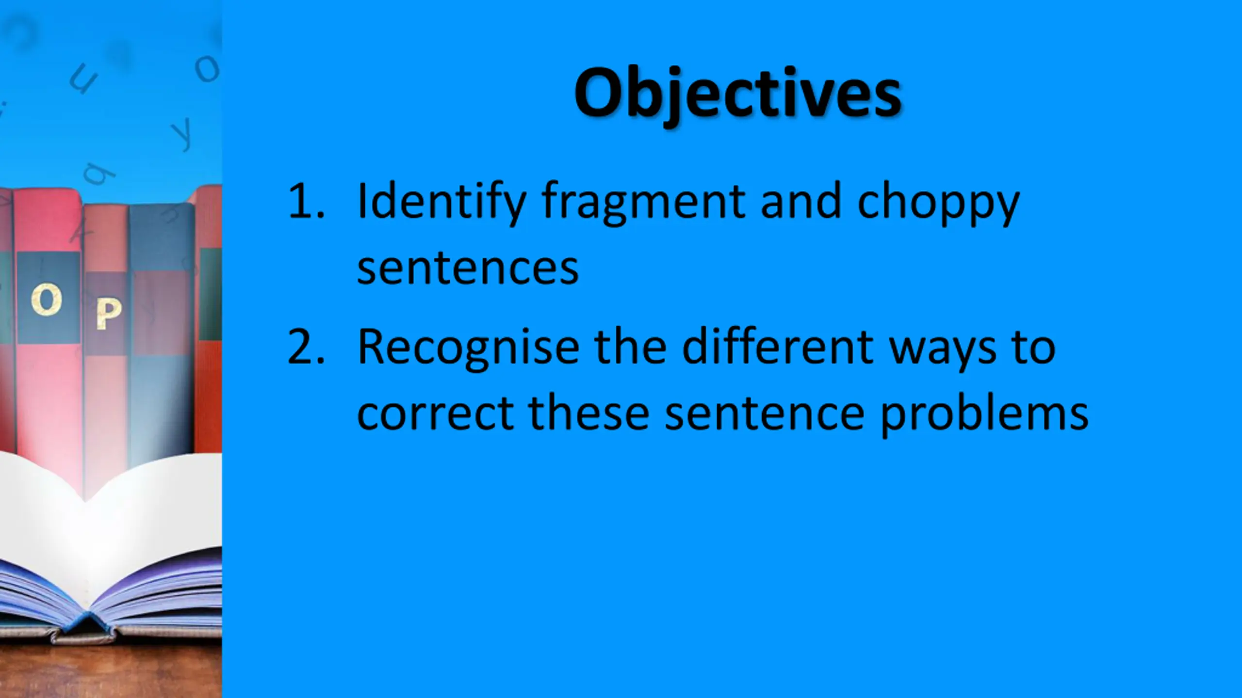 Objectives 1. Identify fragment and choppy sentences 2. Recognise the different ways to correct these sentence problems