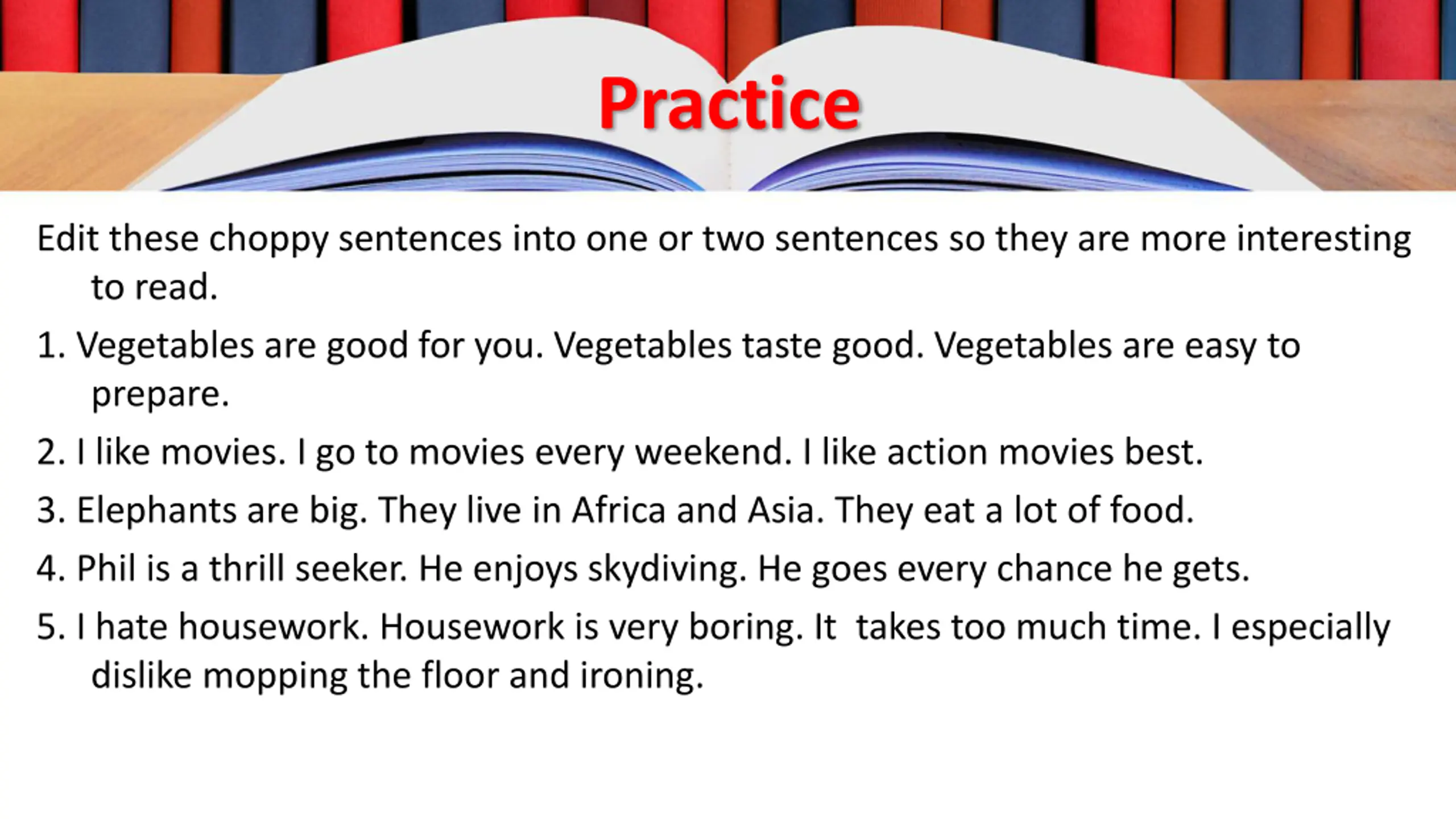 Practice Edit these choppy sentences into one or two sentences so they are more interesting to read. 1. Vegetables are good for you. Vegetables taste good. Vegetables are easy to prepare. 2. I like movies. I go to movies every weekend. I like action movies best. 3. Elephants are big. They live in Africa and Asia. They eat a lot of food. 4. Phil is a thrill seeker. He enjoys skydiving. He goes every chance he gets. 5. I hate housework. Housework is very boring. It takes too much time. I especially dislike mopping the floor and ironing.