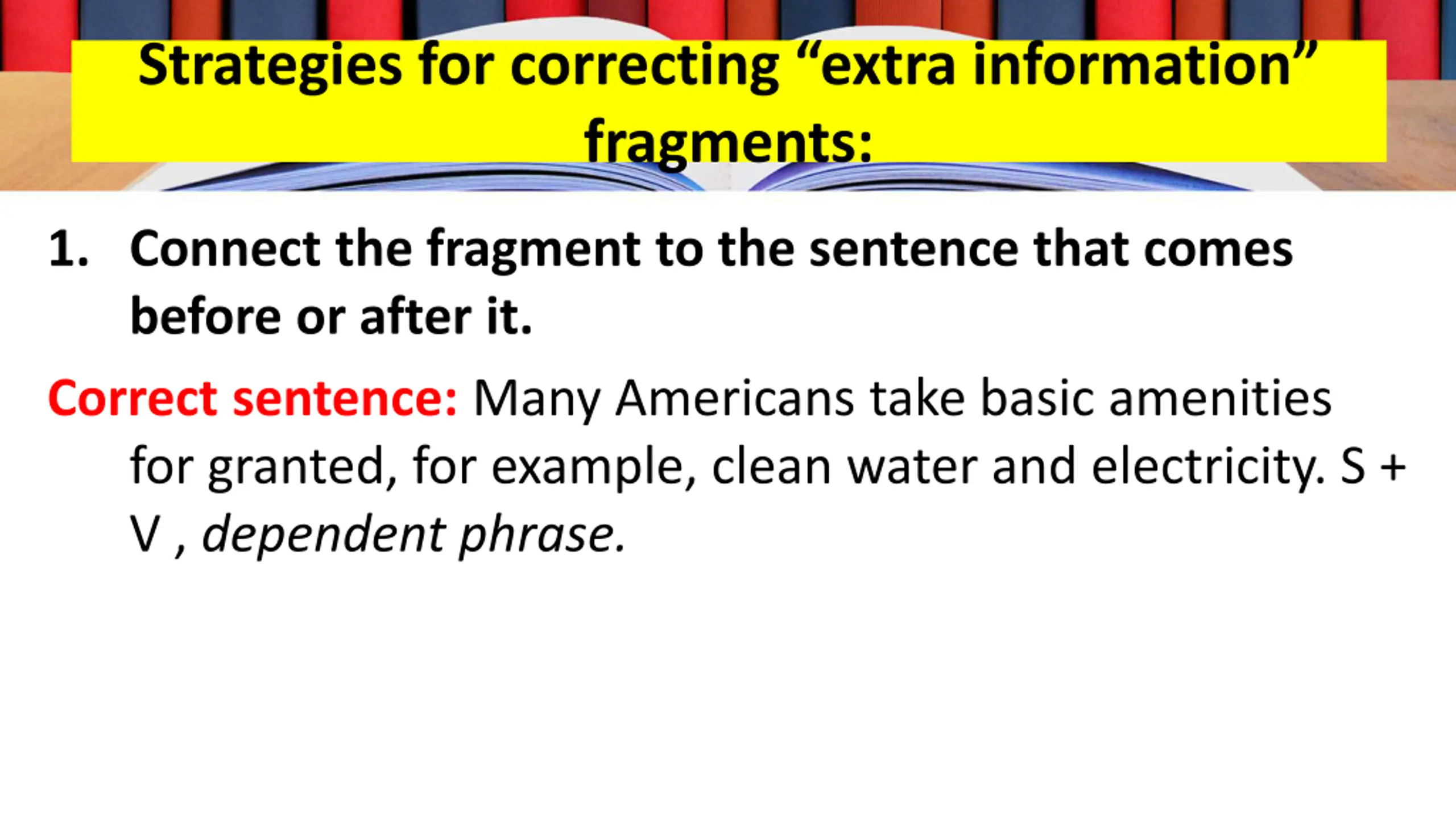Strategies for correcting extra information fragments: 1. Connect the fragment to the sentence that comes before or after it. Correct sentence: Many Americans take basic amenities for granted, for example, clean water and electricity. S + V , dependent phrase.