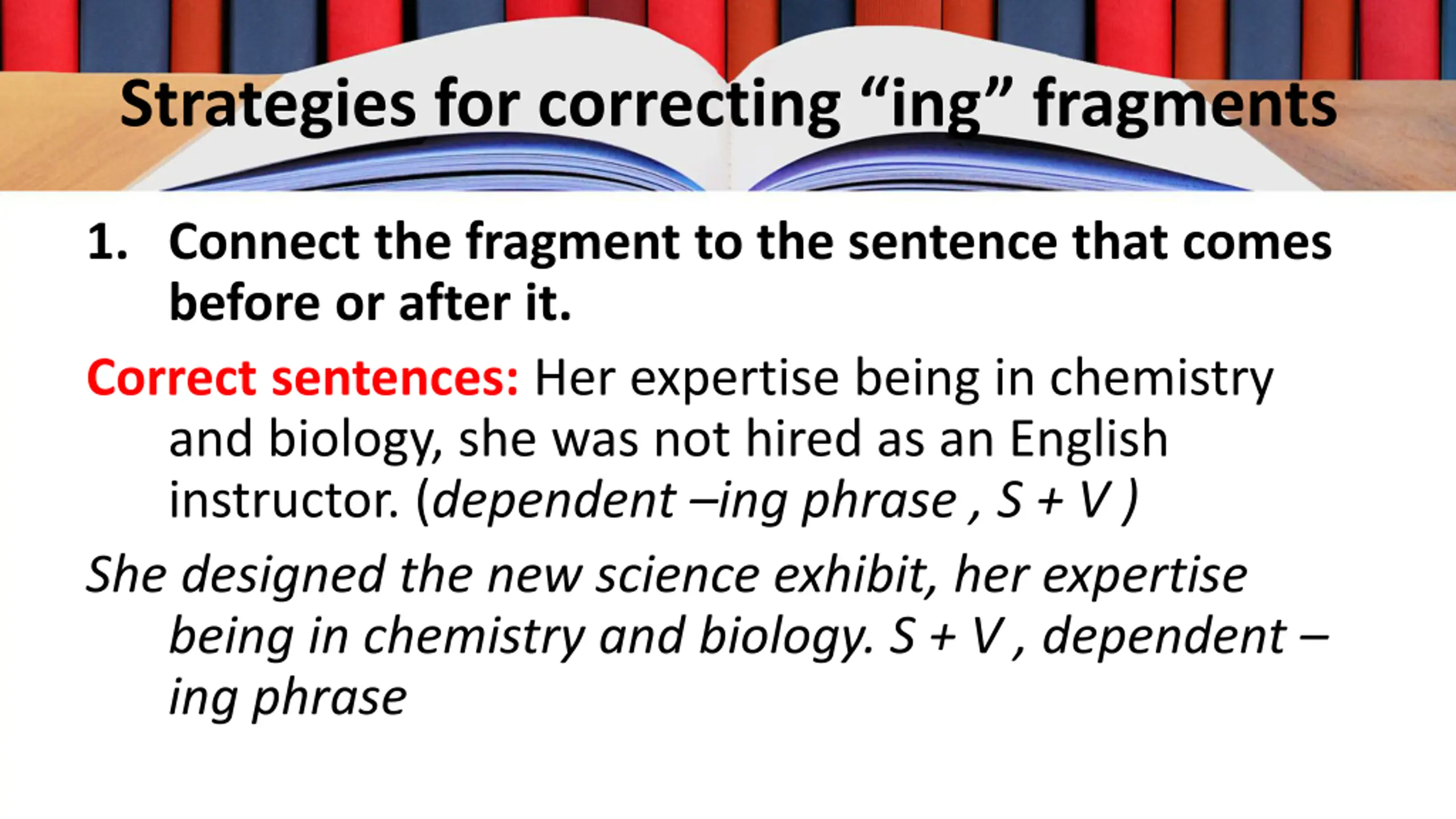 Strategies for correcting ing fragments 1. Connect the fragment to the sentence that comes before or after it. Correct sentences: Her expertise being in chemistry and biology, she was not hired as an English instructor. (dependent ing phrase , S + V ) She designed the new science exhibit, her expertise being in chemistry and biology. S + V , dependent ing phrase