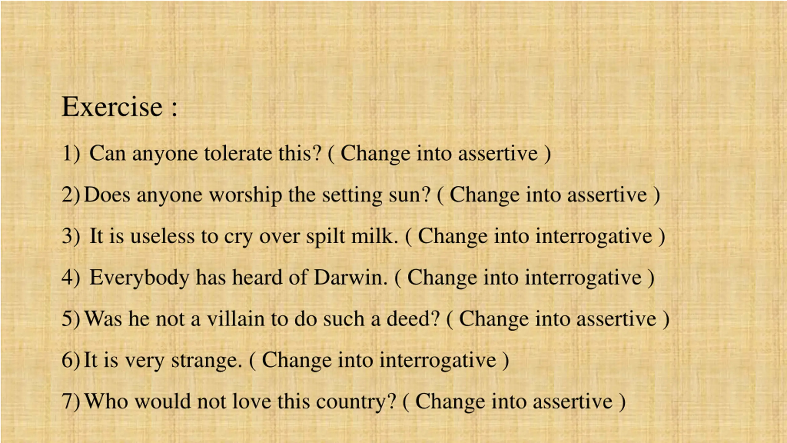 Exercise : 1) Can anyone tolerate this? ( Change into assertive ) 2)Does anyone worship the setting sun? ( Change into assertive ) 3) It is useless to cry over spilt milk. ( Change into interrogative ) 4) Everybody has heard of Darwin. ( Change into interrogative ) 5)Was he not a villain to do such a deed? ( Change into assertive ) 6)It is very strange. ( Change into interrogative ) 7)Who would not love this country? ( Change into assertive )