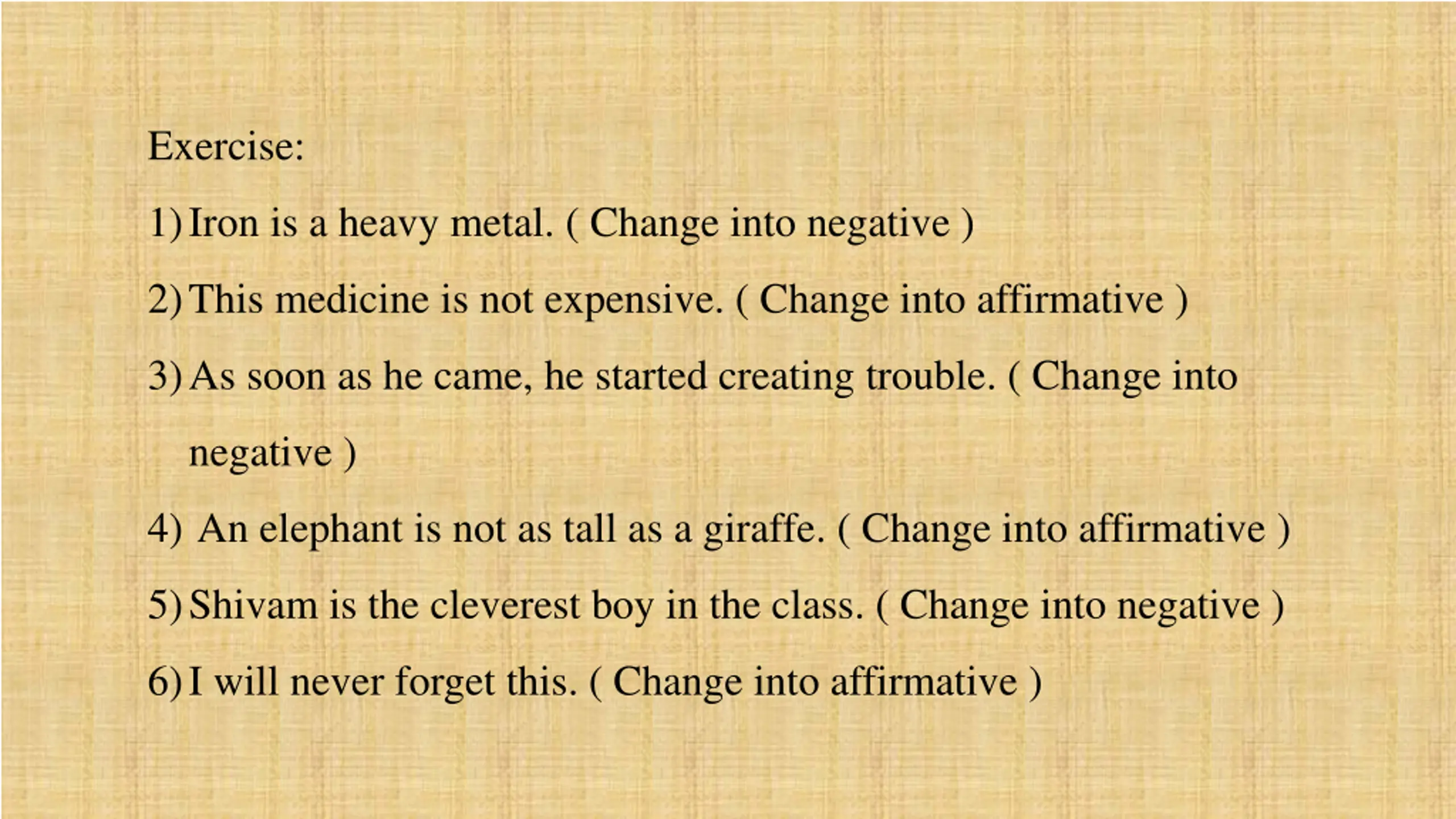 Exercise: 1)Iron is a heavy metal. ( Change into negative ) 2)This medicine is not expensive. ( Change into affirmative ) 3)As soon as he came, he started creating trouble. ( Change into negative ) 4) An elephant is not as tall as a giraffe. ( Change into affirmative ) 5)Shivam is the cleverest boy in the class. ( Change into negative ) 6)I will never forget this. ( Change into affirmative )