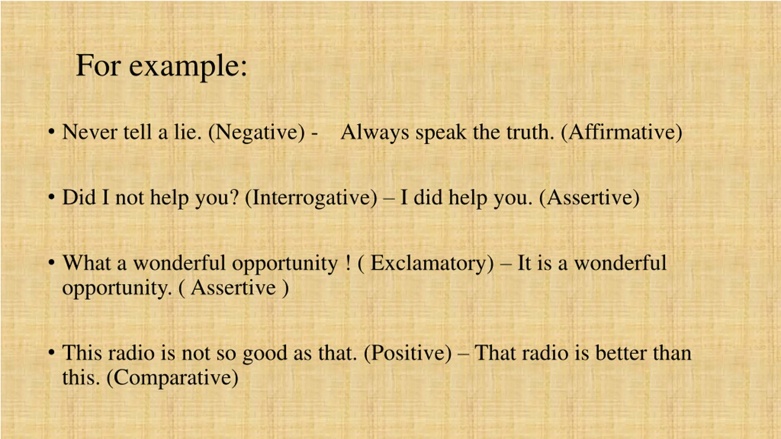 For example: Never tell a lie. (Negative) - Always speak the truth. (Affirmative) Did I not help you? (Interrogative) I did help you. (Assertive) What a wonderful opportunity ! ( Exclamatory) It is a wonderful opportunity. ( Assertive ) This radio is not so good as that. (Positive) That radio is better than this. (Comparative)