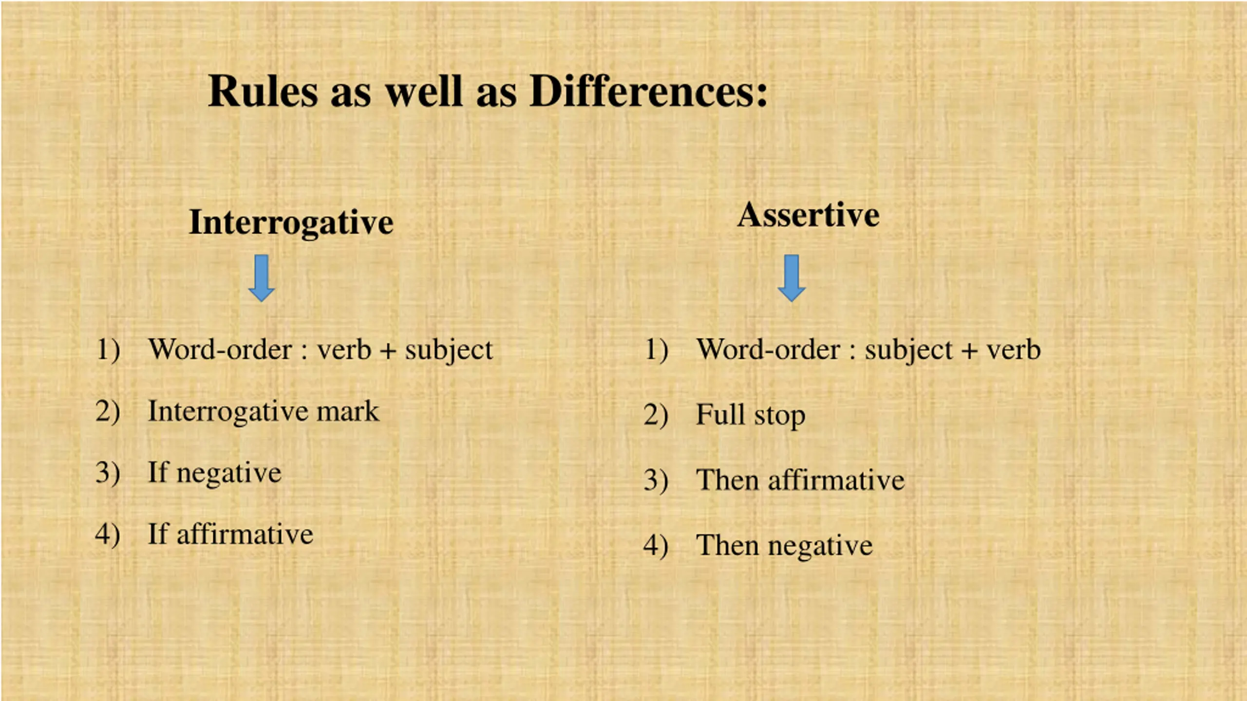 Rules as well as Differences: Assertive Interrogative 1) Word-order : verb + subject 1) Word-order : subject + verb 2) Interrogative mark 2) Full stop 3) If negative 3) Then affirmative 4) If affirmative 4) Then negative