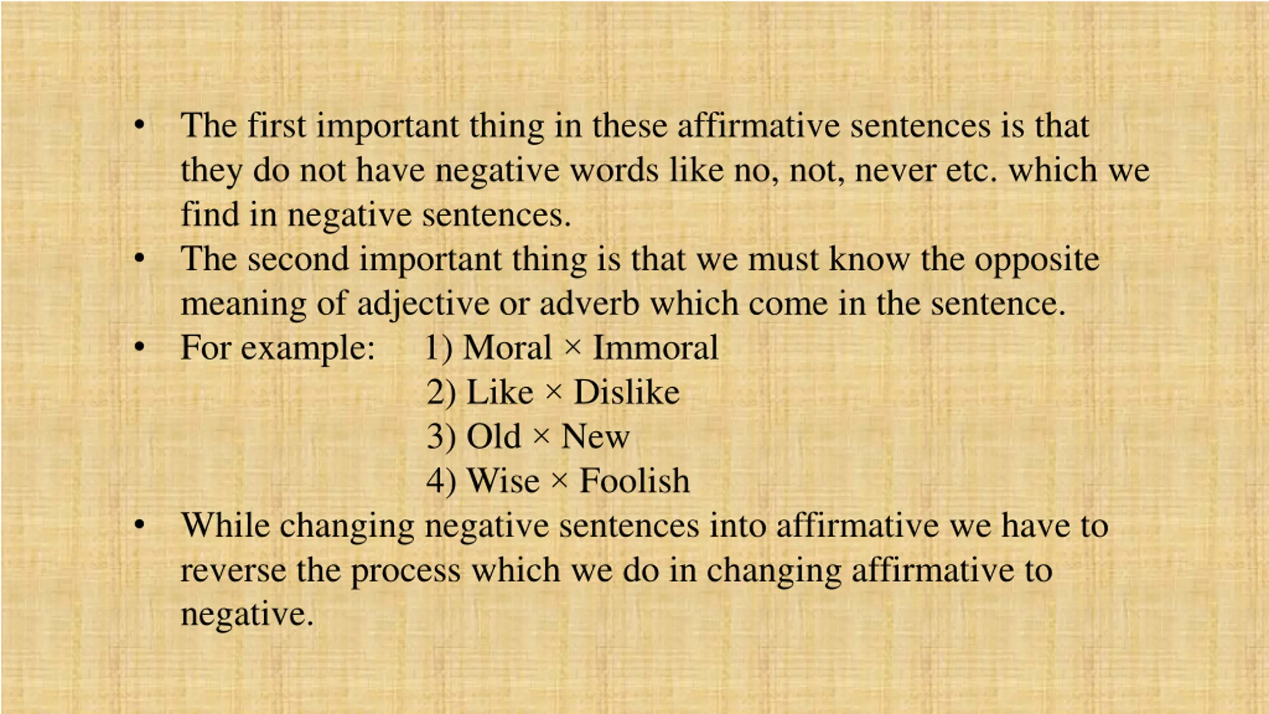 The first important thing in these affirmative sentences is that they do not have negative words like no, not, never etc. which we find in negative sentences. The second important thing is that we must know the opposite meaning of adjective or adverb which come in the sentence. For example: 1) Moral Immoral 2) Like Dislike 3) Old New 4) Wise Foolish While changing negative sentences into affirmative we have to reverse the process which we do in changing affirmative to negative.
