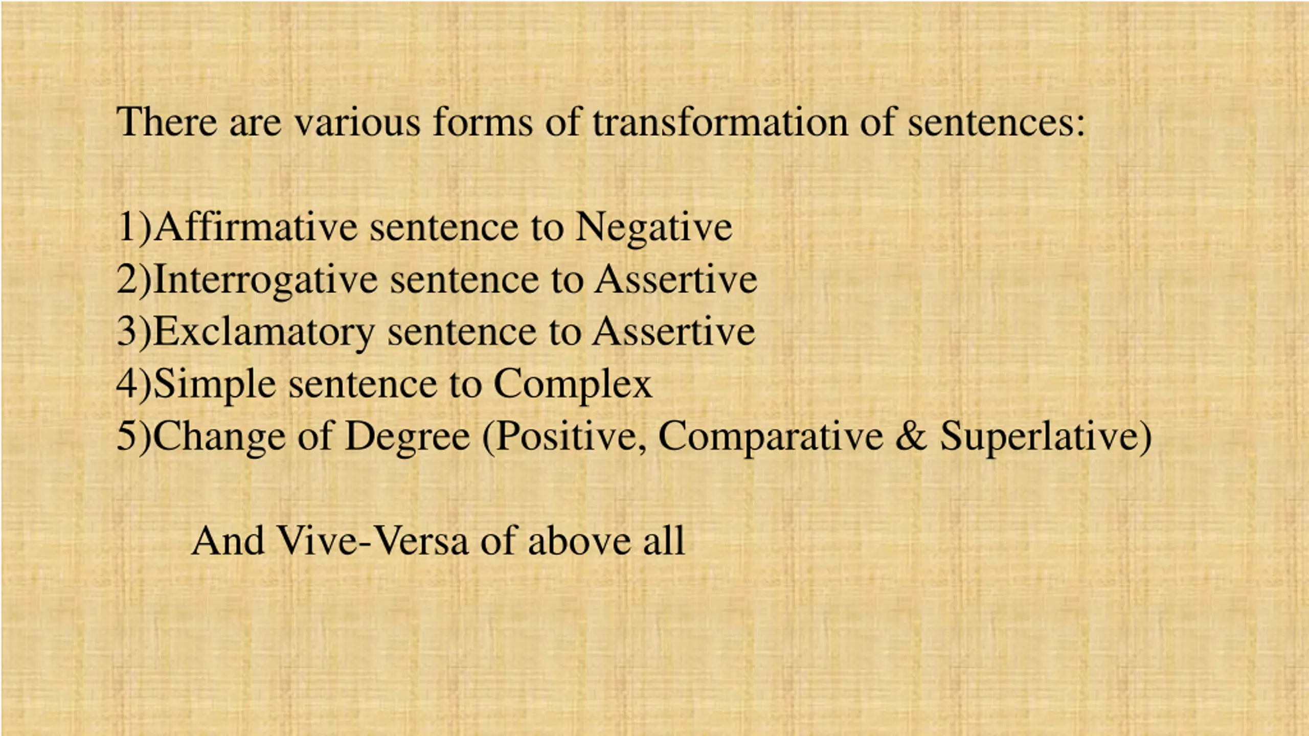 There are various forms of transformation of sentences: 1)Affirmative sentence to Negative 2)Interrogative sentence to Assertive 3)Exclamatory sentence to Assertive 4)Simple sentence to Complex 5)Change of Degree (Positive, Comparative & Superlative) And Vive-Versa of above all