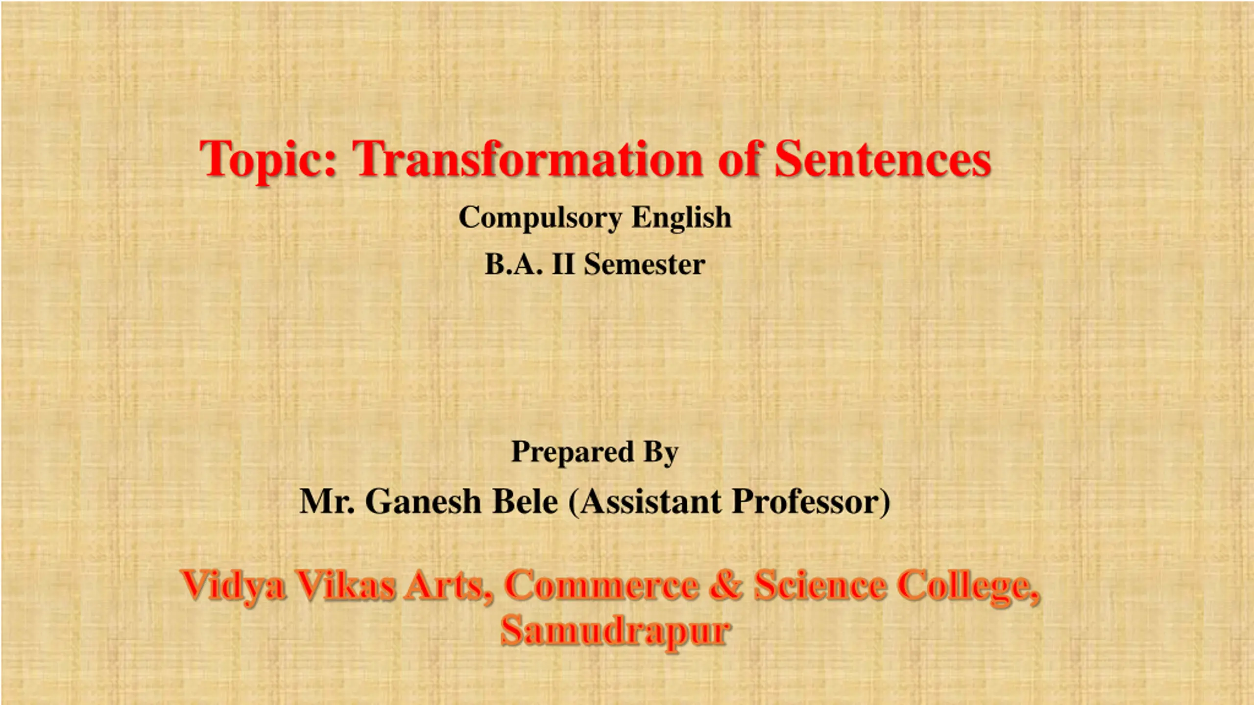 Topic: Transformation of Sentences Compulsory English B.A. II Semester Prepared By Mr. Ganesh Bele (Assistant Professor) Vidya VikasArts, Commerce & Science College, Samudrapur