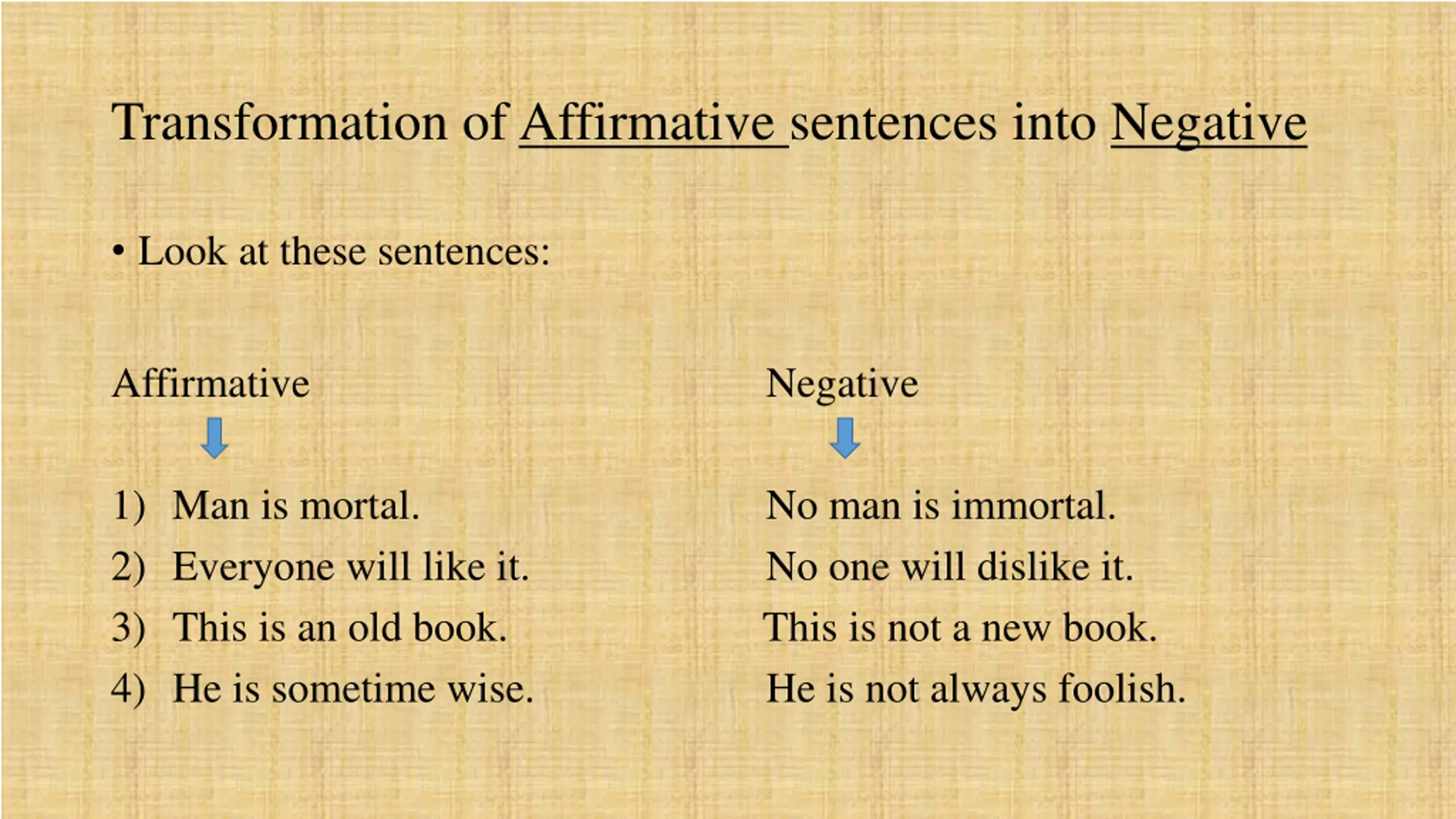 Transformation of Affirmative sentences into Negative Look at these sentences: Affirmative Negative 1) Man is mortal. 2) Everyone will like it. 3) This is an old book. 4) He is sometime wise. This is not a new book. He is not always foolish. No man is immortal. No one will dislike it.