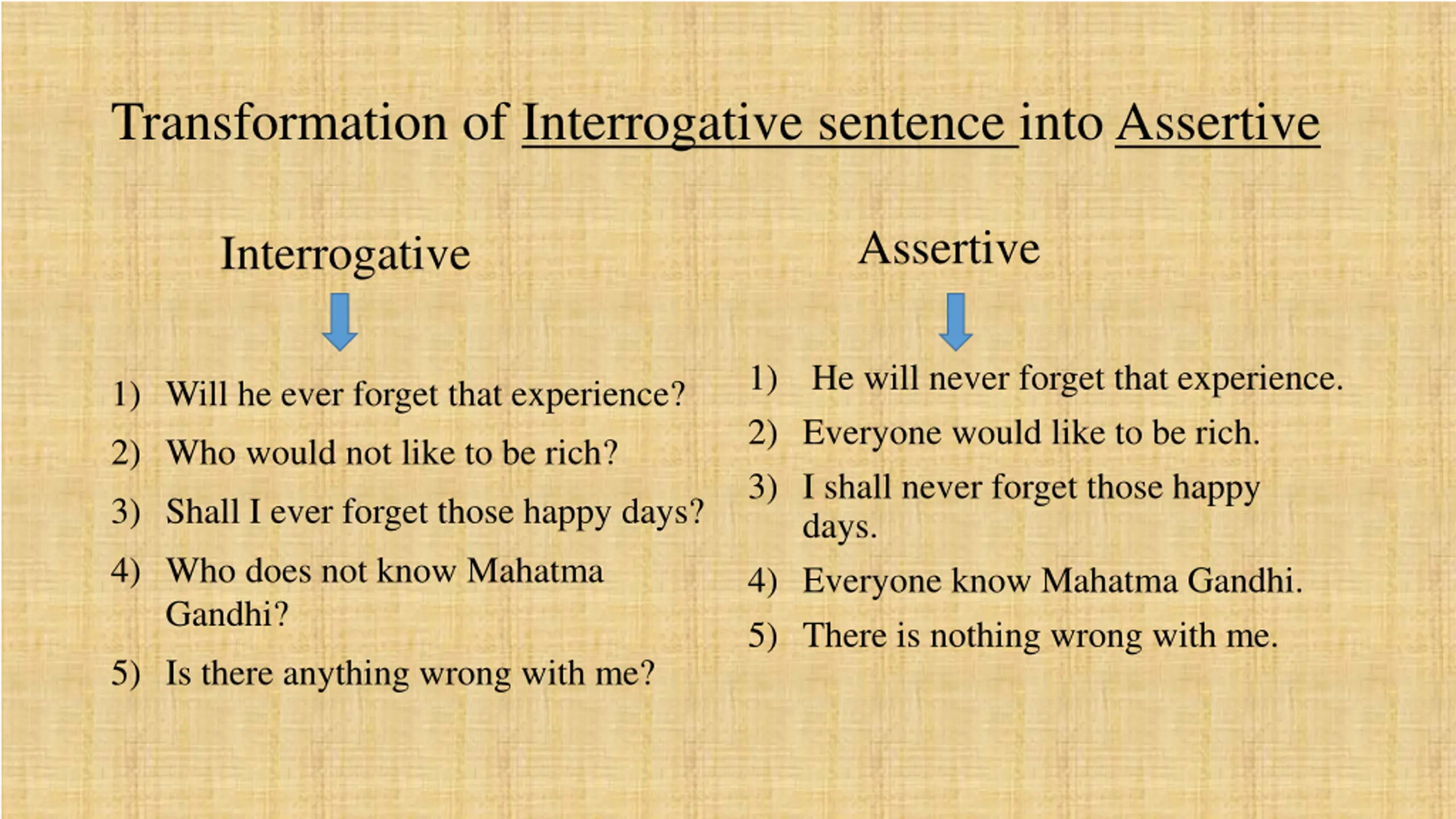 Transformation of Interrogative sentence into Assertive Assertive Interrogative 1) 2) Everyone would like to be rich. 3) I shall never forget those happy days. 4) Everyone know Mahatma Gandhi. 5) There is nothing wrong with me. He will never forget that experience. 1) Will he ever forget that experience? 2) Who would not like to be rich? 3) Shall I ever forget those happy days? 4) Who does not know Mahatma Gandhi? 5) Is there anything wrong with me?