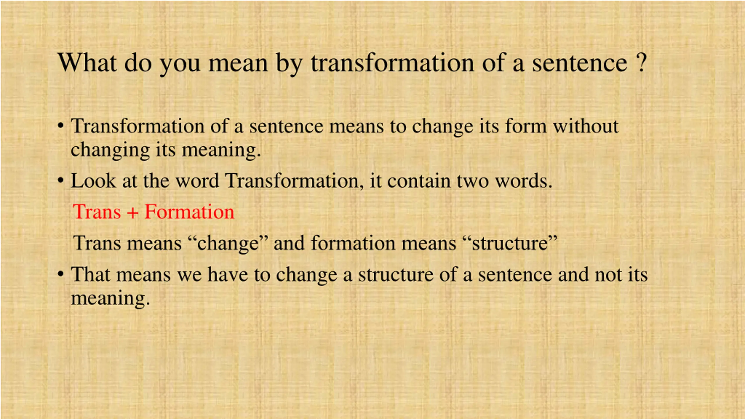 What do you mean by transformation of a sentence ? Transformation of a sentence means to change its form without changing its meaning. Look at the word Transformation, it contain two words. Trans + Formation Trans means change and formation means structure That means we have to change a structure of a sentence and not its meaning.