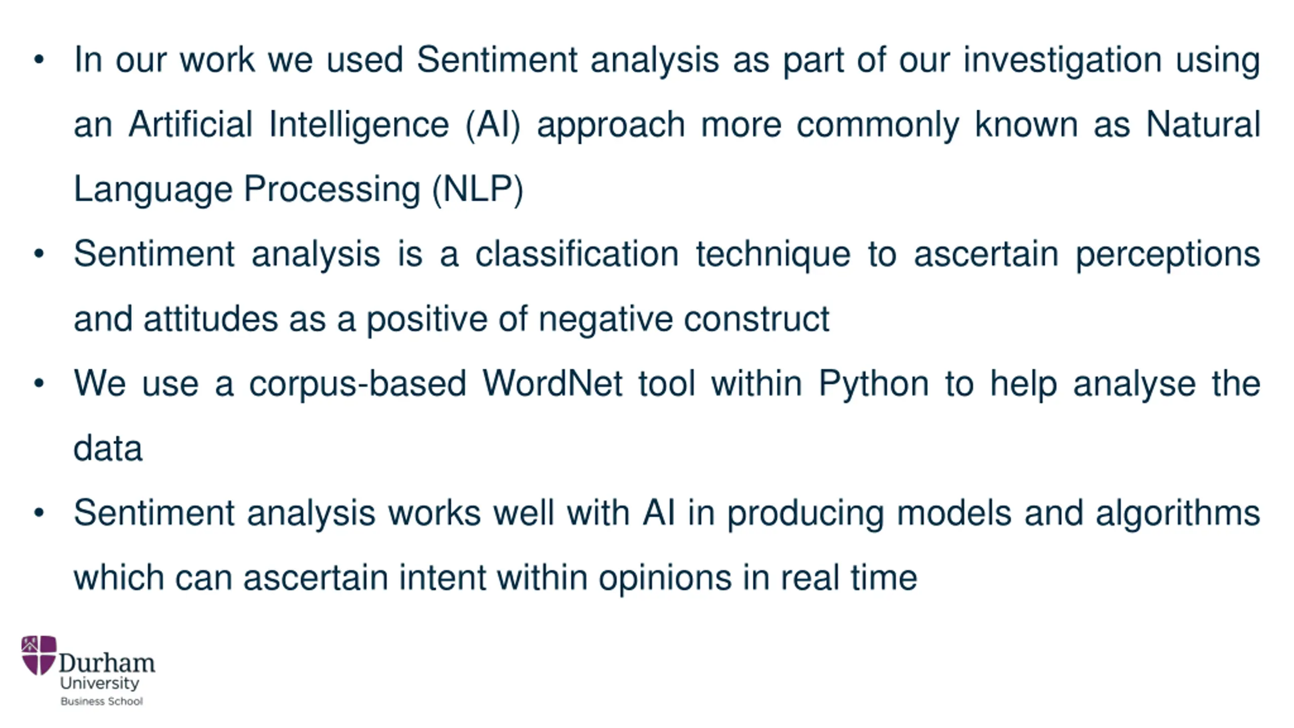 In our work we used Sentiment analysis as part of our investigation using an Artificial Intelligence (AI) approach more commonly known as Natural Language Processing (NLP) Sentiment analysis is a classification technique to ascertain perceptions and attitudes as a positive of negative construct We use a corpus-based WordNet tool within Python to help analyse the data Sentiment analysis works well with AI in producing models and algorithms which can ascertain intent within opinions in real time