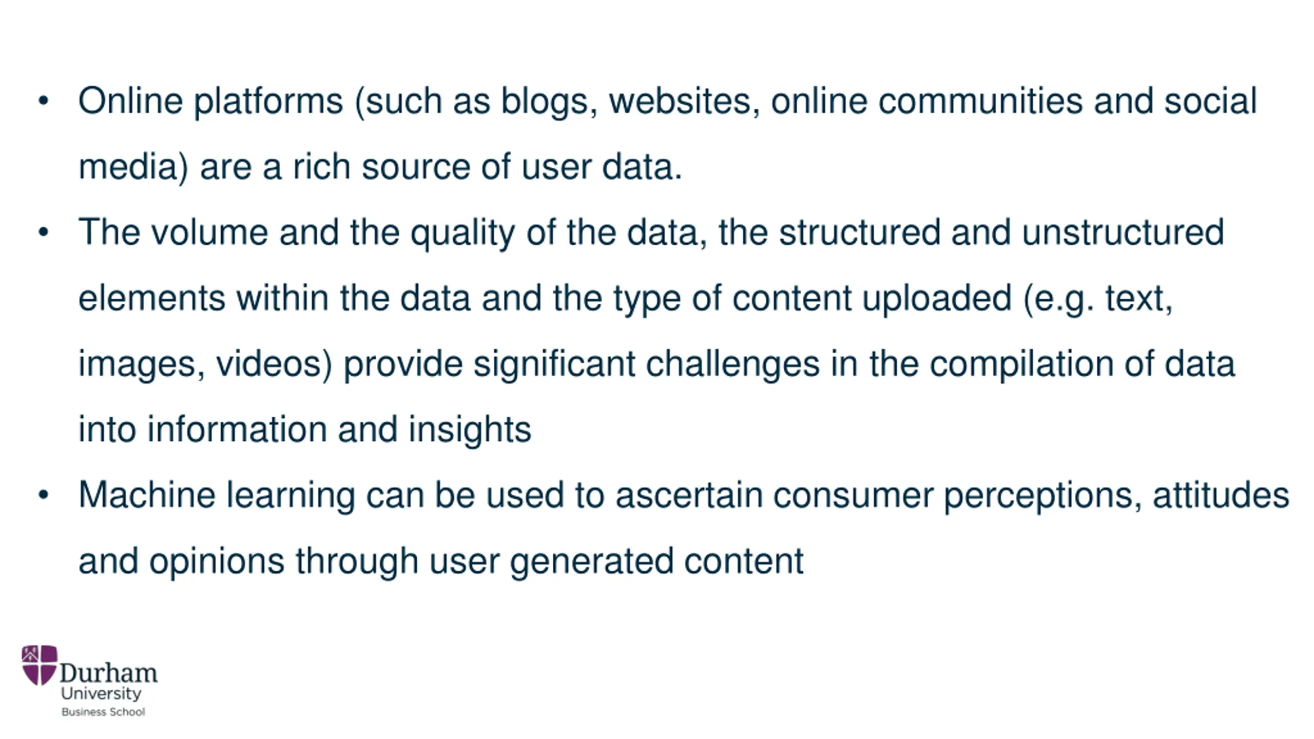 Online platforms (such as blogs, websites, online communities and social media) are a rich source of user data. The volume and the quality of the data, the structured and unstructured elements within the data and the type of content uploaded (e.g. text, images, videos) provide significant challenges in the compilation of data into information and insights Machine learning can be used to ascertain consumer perceptions, attitudes and opinions through user generated content
