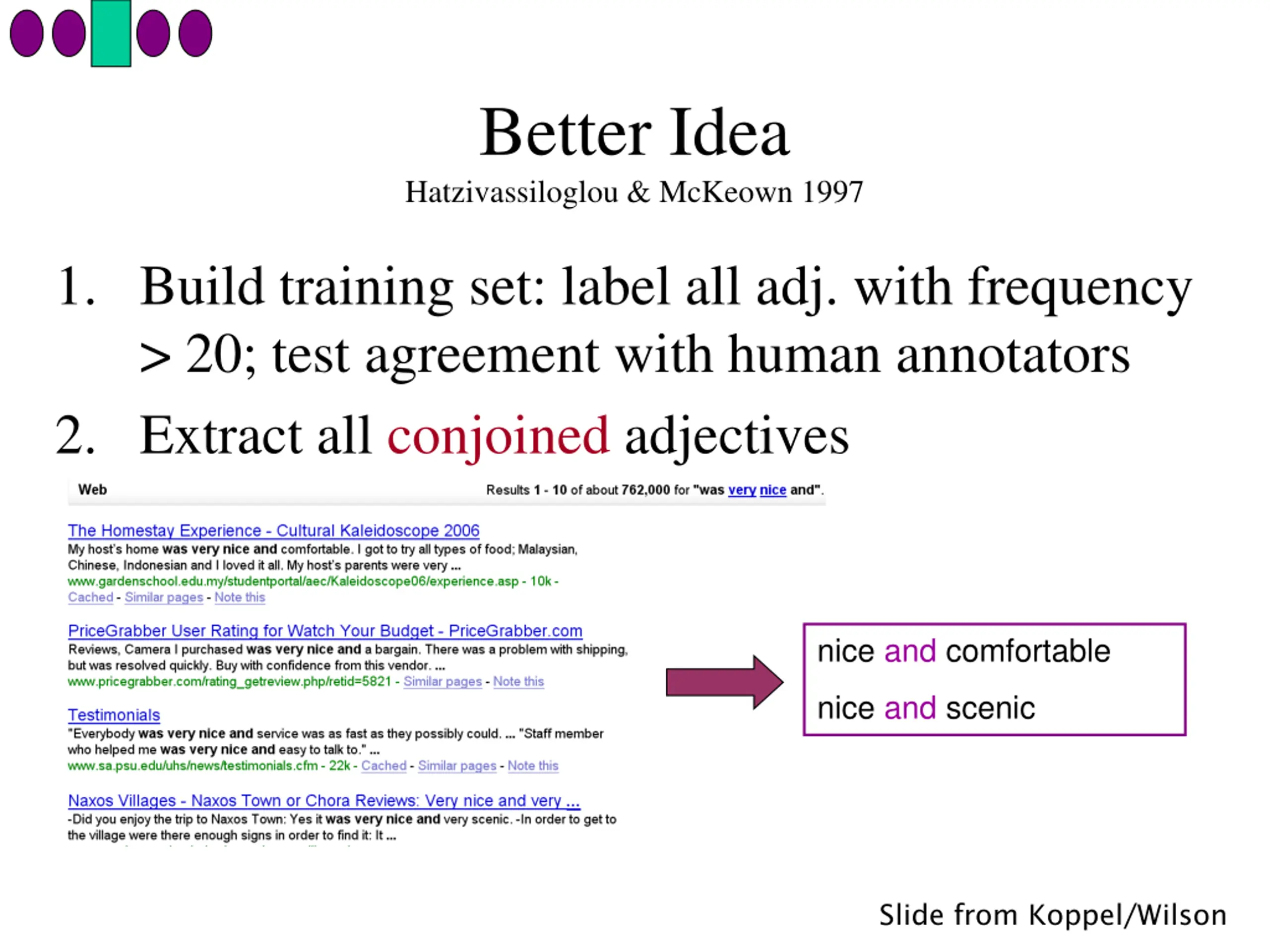 Better Idea Hatzivassiloglou & McKeown 1997 1. Build training set: label all adj. with frequency > 20; test agreement with human annotators 2. Extract all conjoined adjectives nice and comfortable nice and scenic Slide from Koppel/Wilson