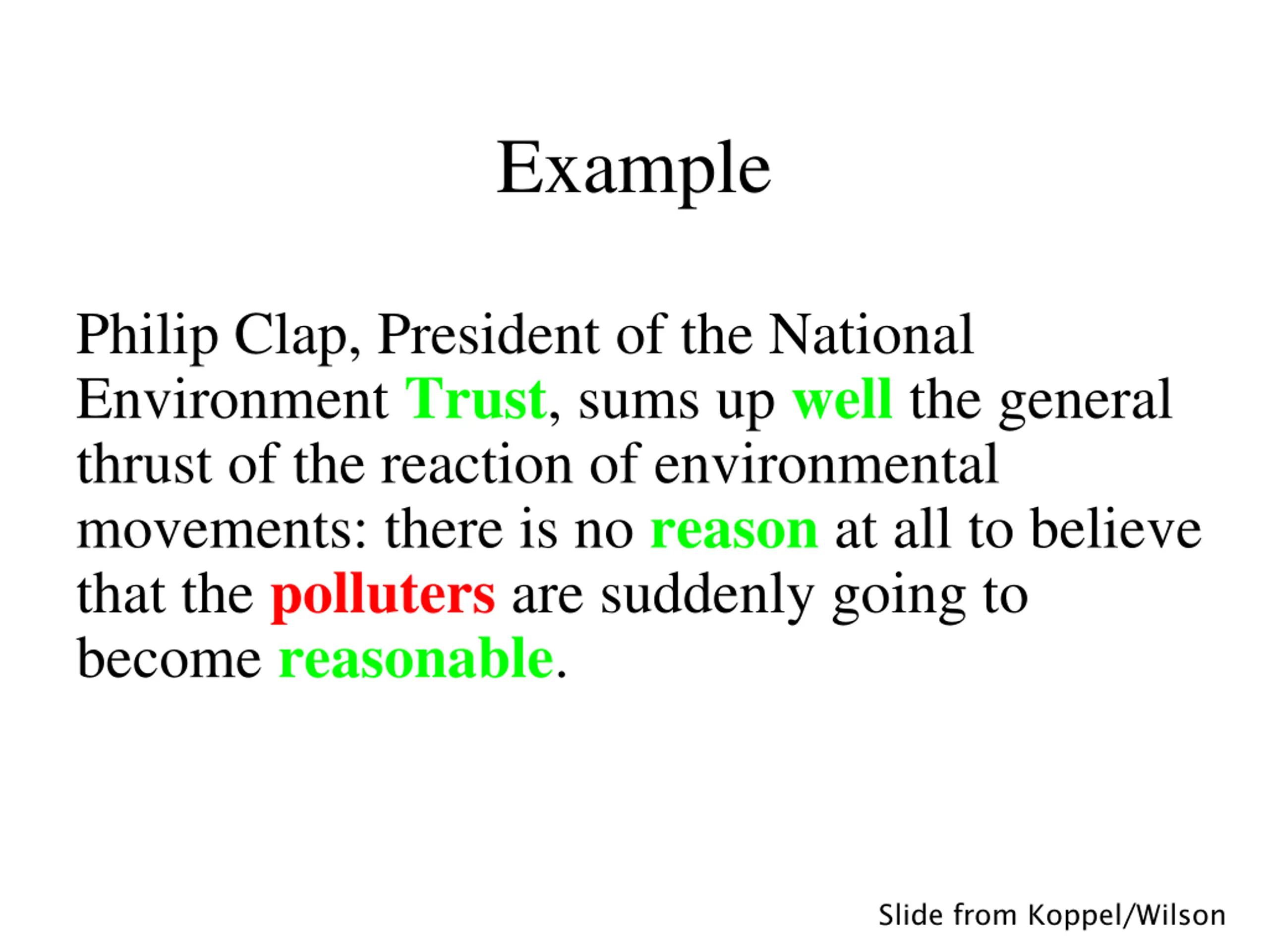 Example Philip Clap, President of the National Environment Trust, sums up well the general thrust of the reaction of environmental movements: there is no reason at all to believe that the polluters are suddenly going to become reasonable. Slide from Koppel/Wilson