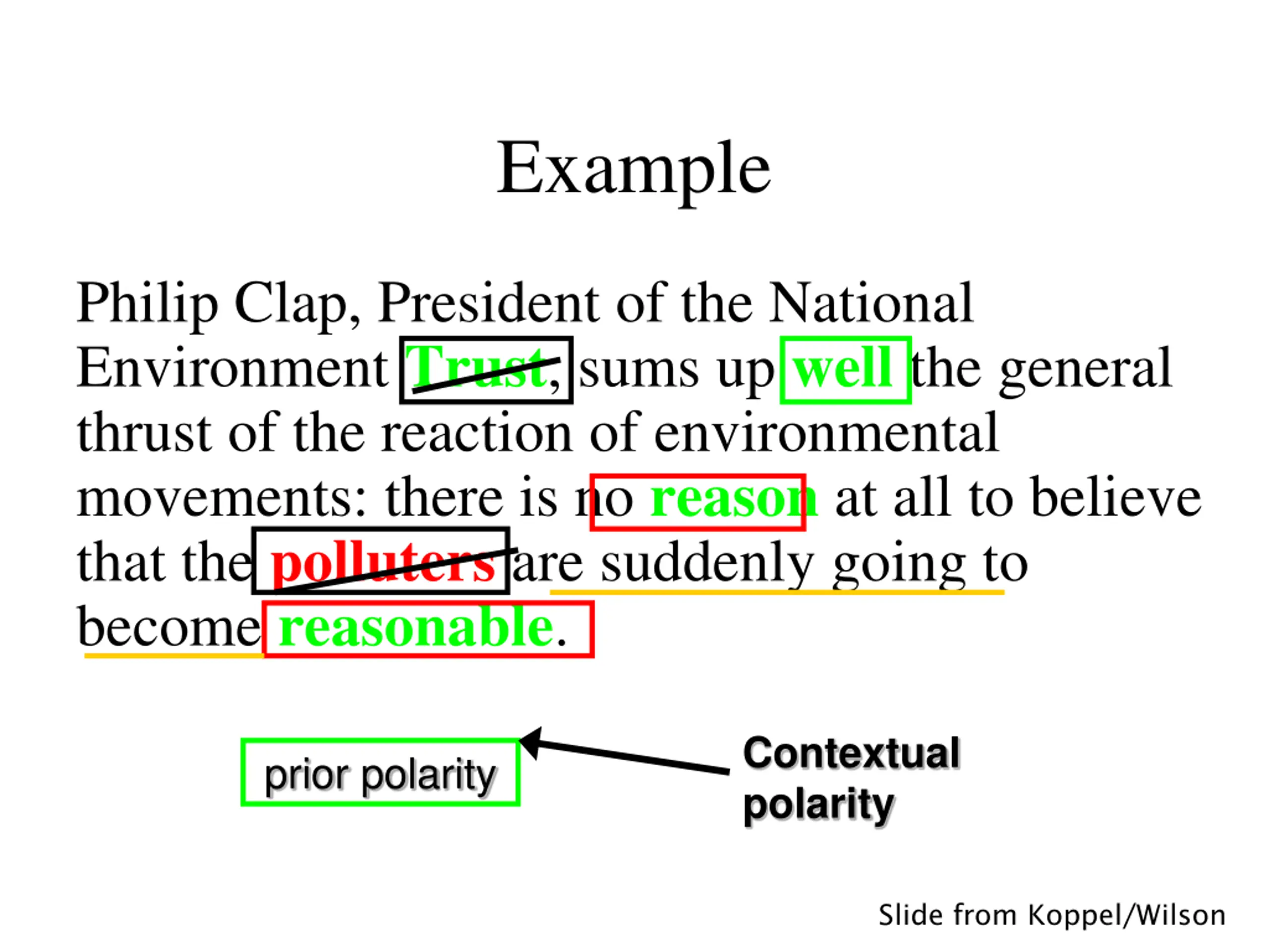 Example Philip Clap, President of the National Environment Trust, sums up well the general thrust of the reaction of environmental movements: there is no reason at all to believe that the polluters are suddenly going to become reasonable. Contextual polarity prior polarity Slide from Koppel/Wilson