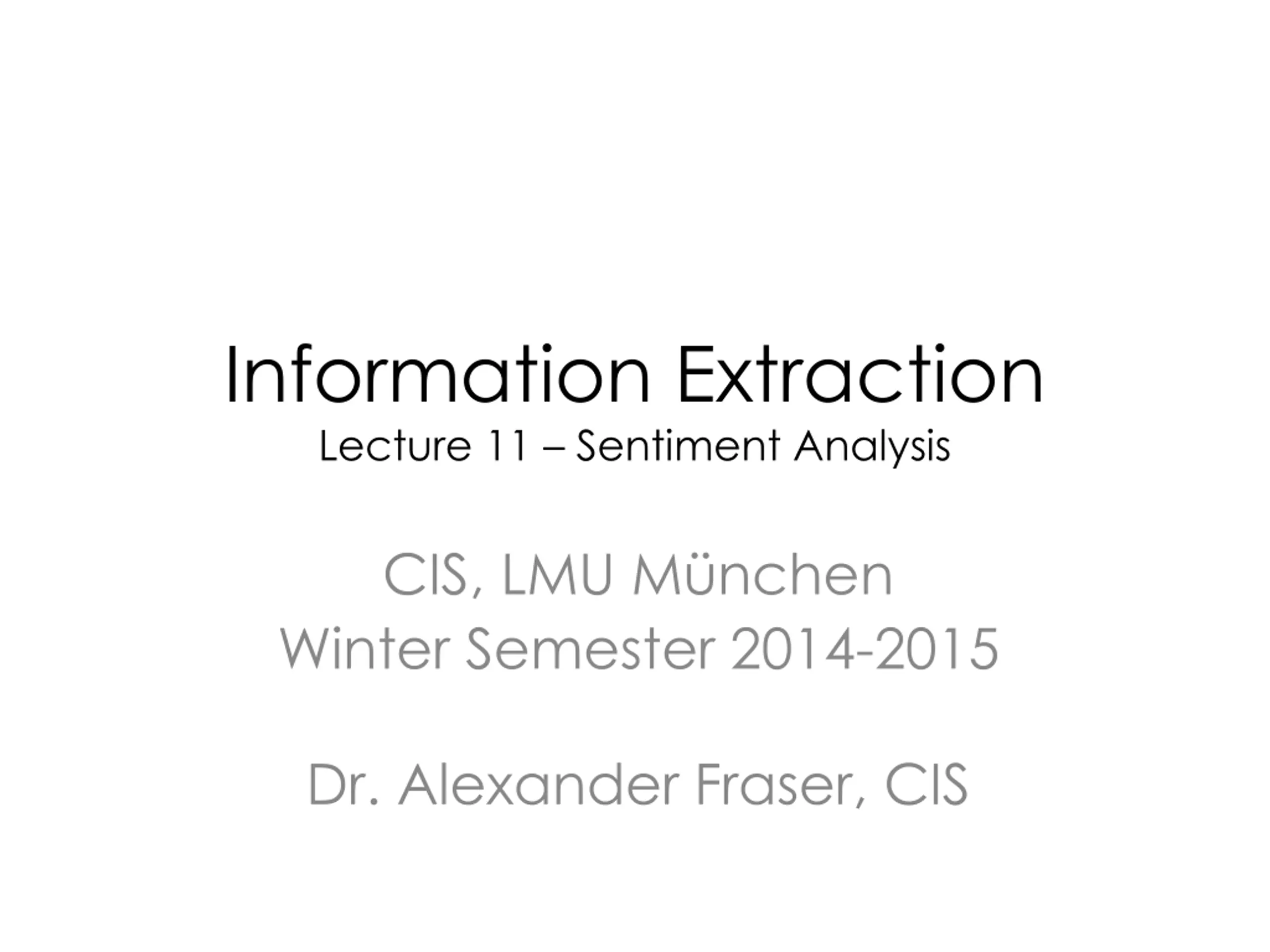 Information Extraction Lecture 11 Sentiment Analysis CIS, LMU M nchen Winter Semester 2014-2015 Dr. Alexander Fraser, CIS