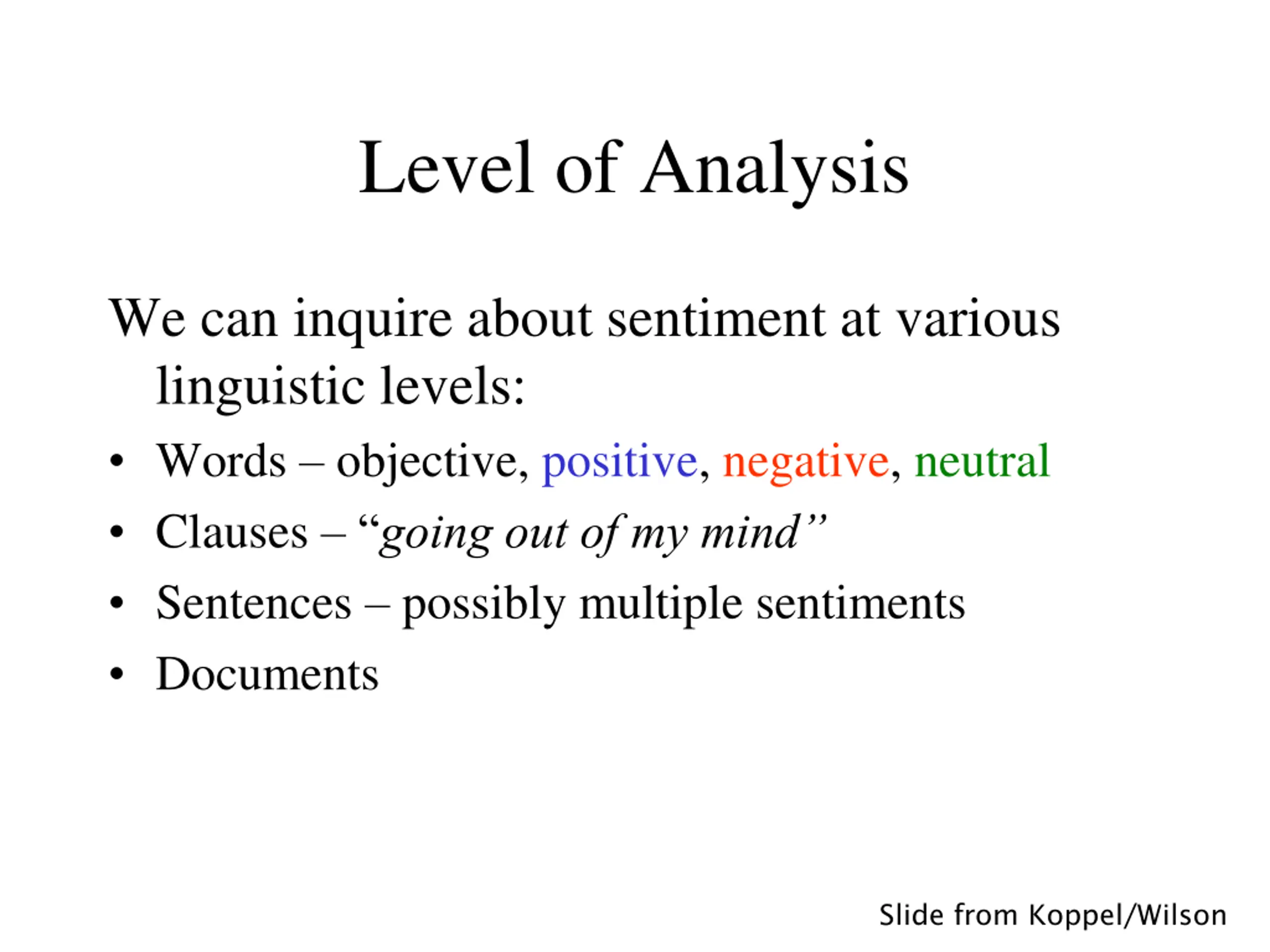 Level of Analysis We can inquire about sentiment at various linguistic levels: Words objective, positive, negative, neutral Clauses going out of my mind Sentences possibly multiple sentiments Documents Slide from Koppel/Wilson