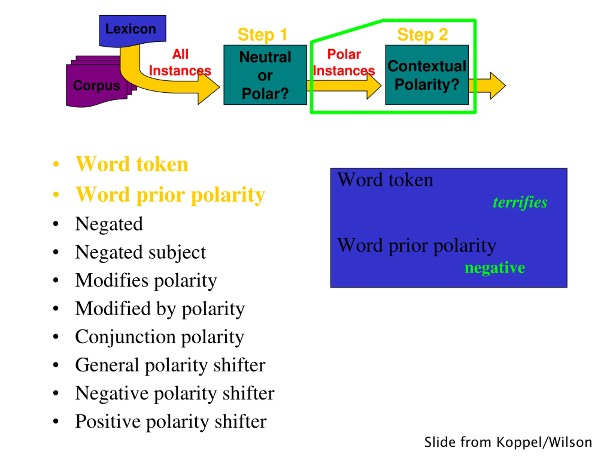 Lexicon Step 1 Step 2 All Polar Instances Neutral or Polar? Contextual Polarity? Instances Corpus Word token Word prior polarity Negated Negated subject Modifies polarity Modified by polarity Conjunction polarity General polarity shifter Negative polarity shifter Positive polarity shifter Word token terrifies Word prior polarity negative Slide from Koppel/Wilson