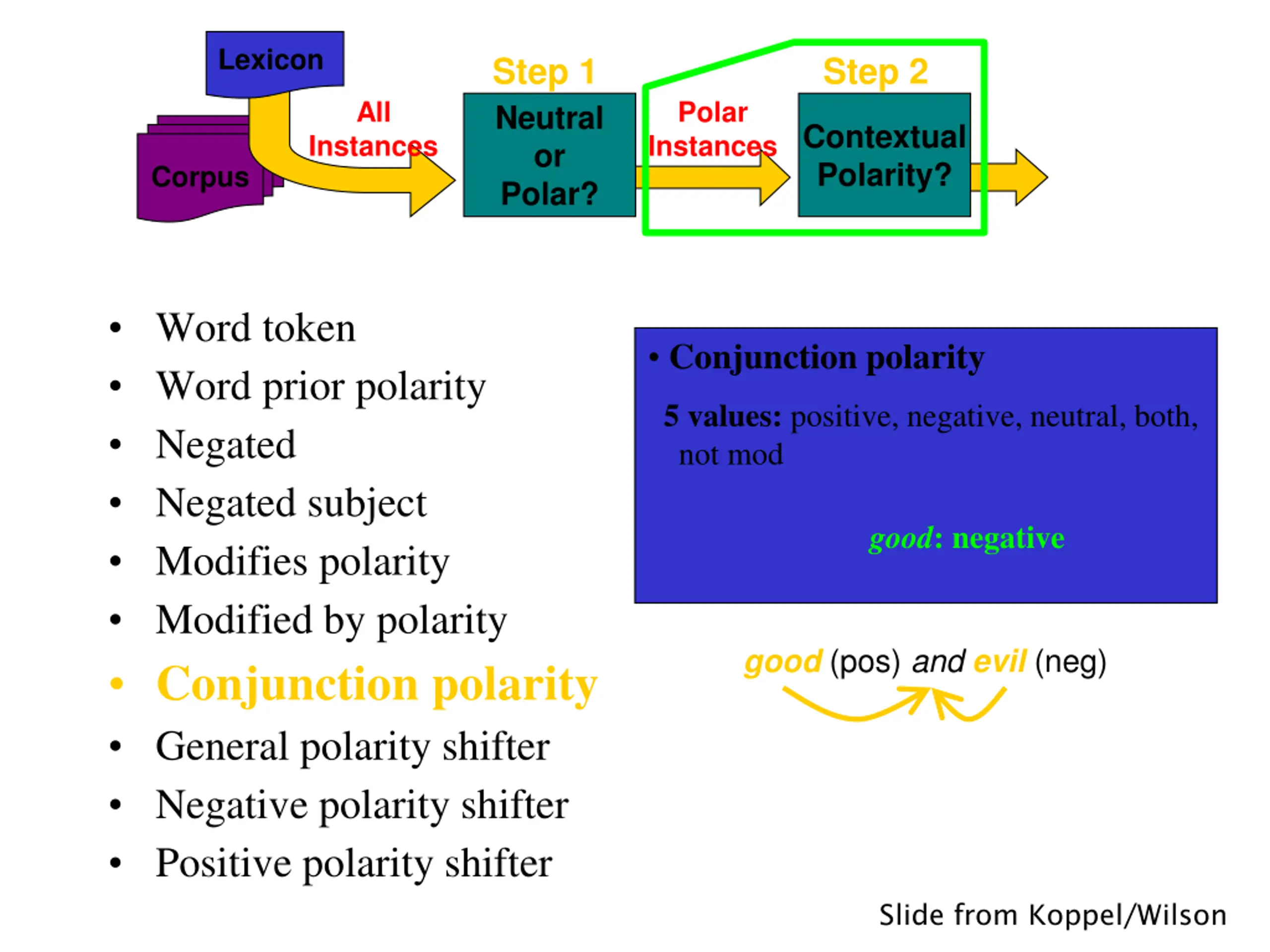 Lexicon Step 1 Step 2 All Polar Instances Neutral or Polar? Contextual Polarity? Instances Corpus Word token Word prior polarity Negated Negated subject Modifies polarity Modified by polarity Conjunction polarity General polarity shifter Negative polarity shifter Positive polarity shifter Conjunction polarity 5 values: positive, negative, neutral, both, not mod good: negative good (pos) and evil (neg) Slide from Koppel/Wilson