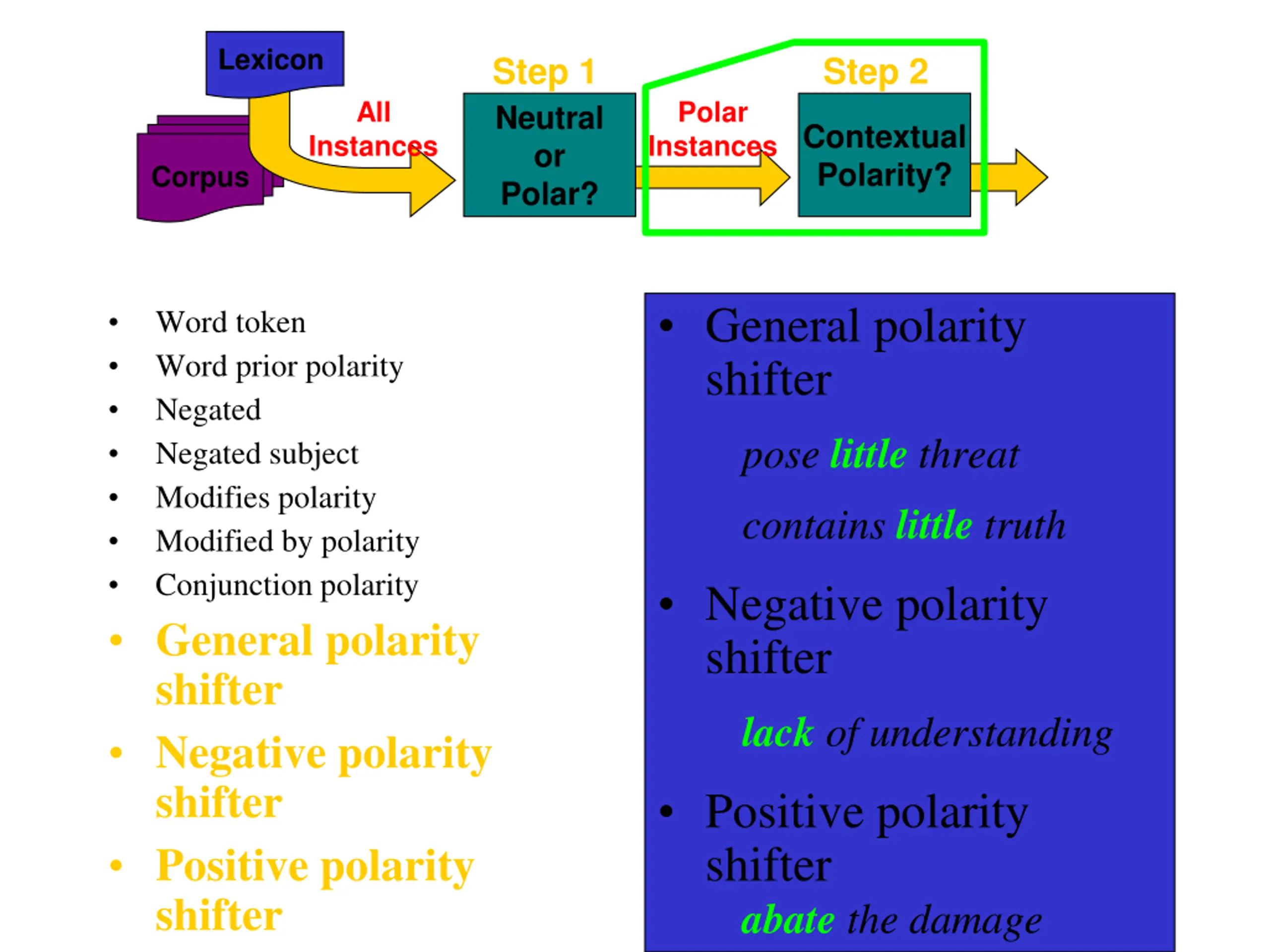 Lexicon Step 1 Step 2 All Polar Instances Neutral or Polar? Contextual Polarity? Instances Corpus General polarity shifter Word token Word prior polarity Negated Negated subject Modifies polarity Modified by polarity Conjunction polarity General polarity shifter Negative polarity shifter Positive polarity shifter pose little threat contains little truth Negative polarity shifter lack of understanding Positive polarity shifter abate the damage