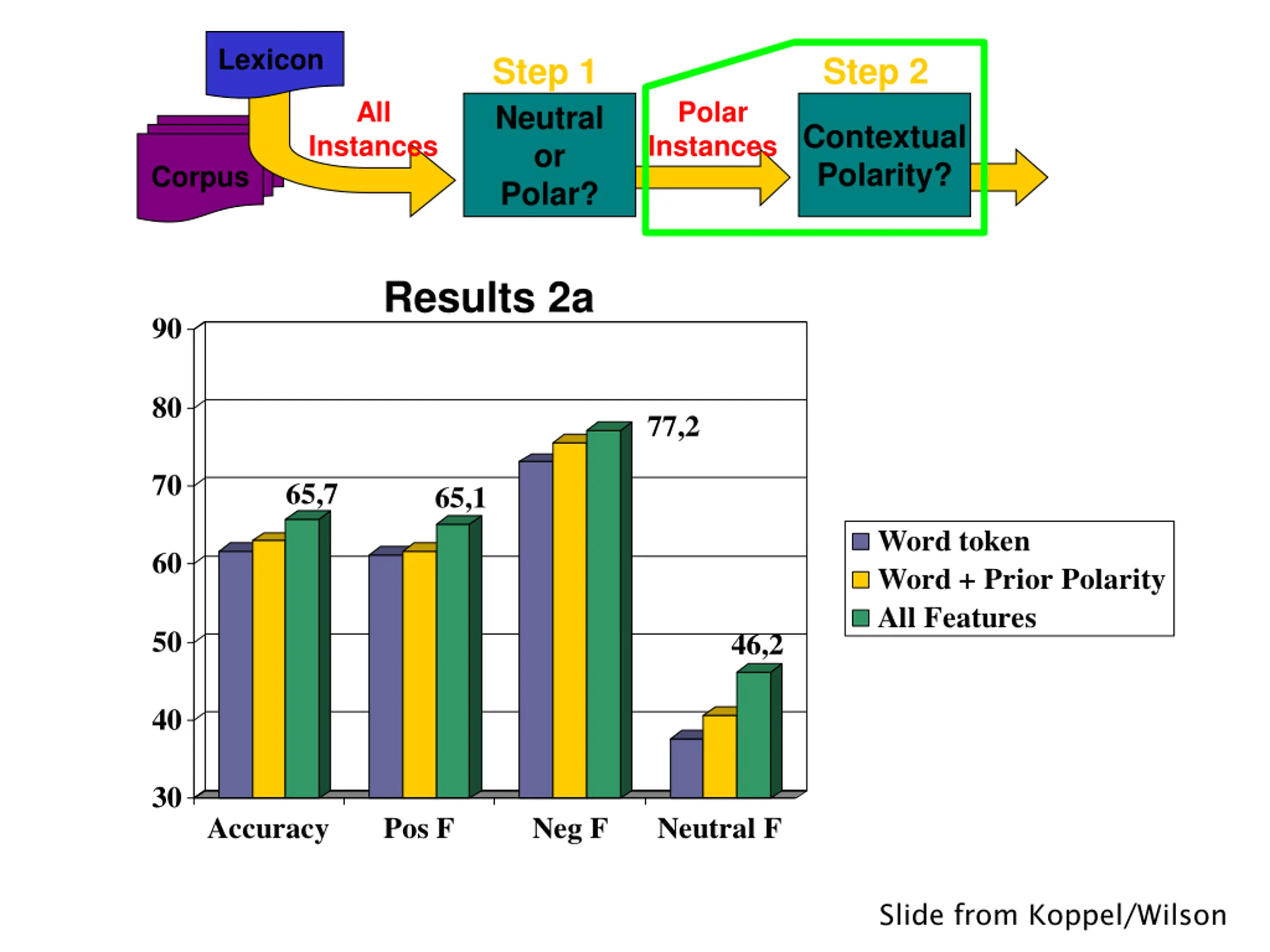 Lexicon Step 1 Step 2 All Polar Instances Neutral or Polar? Contextual Polarity? Instances Corpus Results 2a 90 80 77,2 70 65,7 65,1 Word token Word + Prior Polarity All Features 60 50 46,2 40 30 Accuracy Pos F Neg F Neutral F Slide from Koppel/Wilson