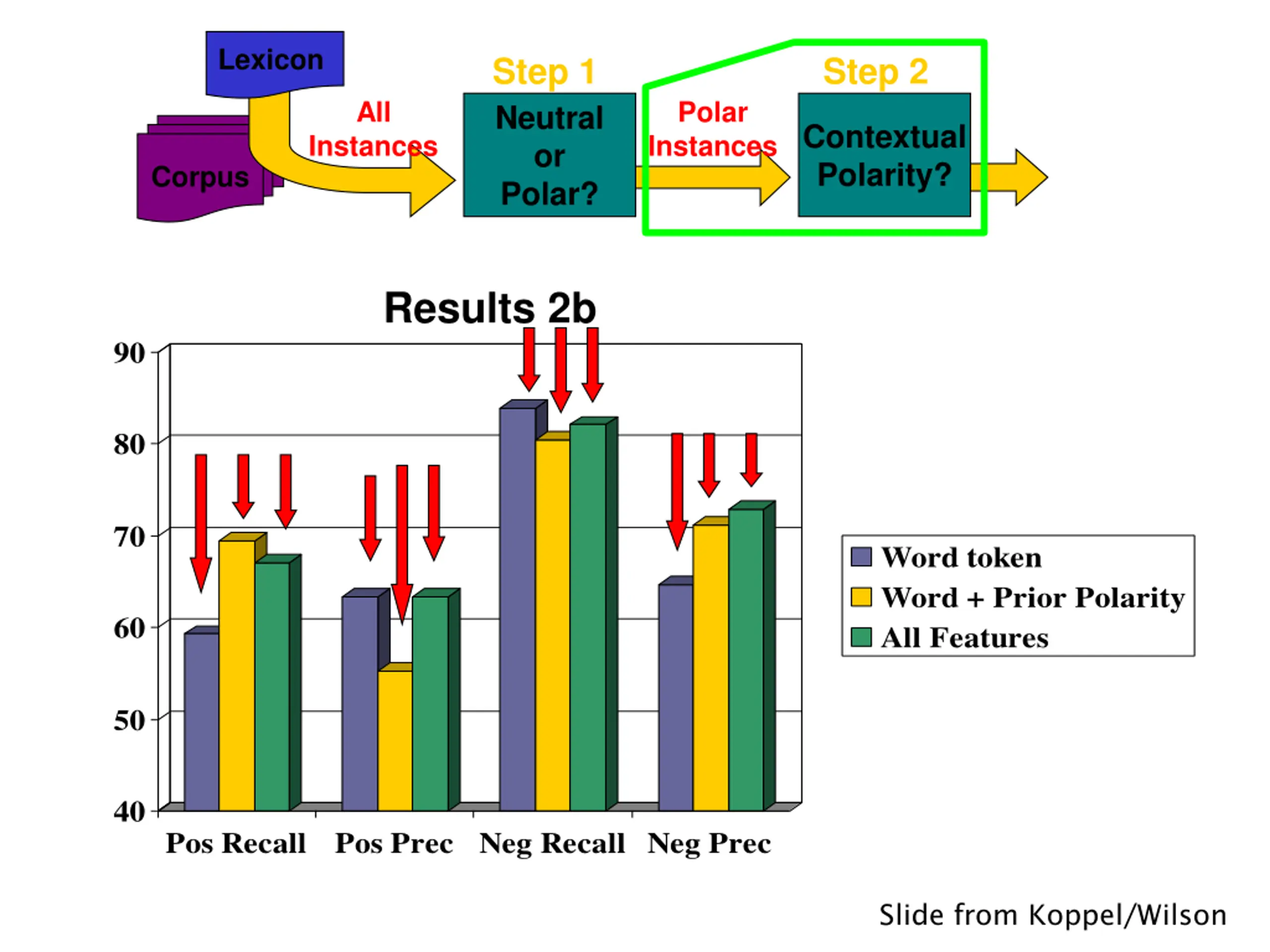 Lexicon Step 1 Step 2 All Polar Instances Neutral or Polar? Contextual Polarity? Instances Corpus Results 2b 90 80 70 Word token Word + Prior Polarity All Features 60 50 40 Pos Recall Pos Prec Neg Recall Neg Prec Slide from Koppel/Wilson