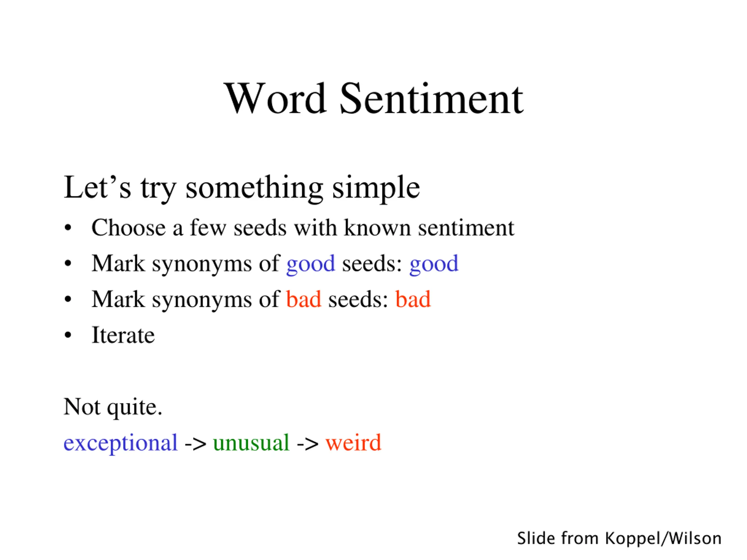 Word Sentiment Let s try something simple Choose a few seeds with known sentiment Mark synonyms of good seeds: good Mark synonyms of bad seeds: bad Iterate Not quite. exceptional -> unusual -> weird Slide from Koppel/Wilson