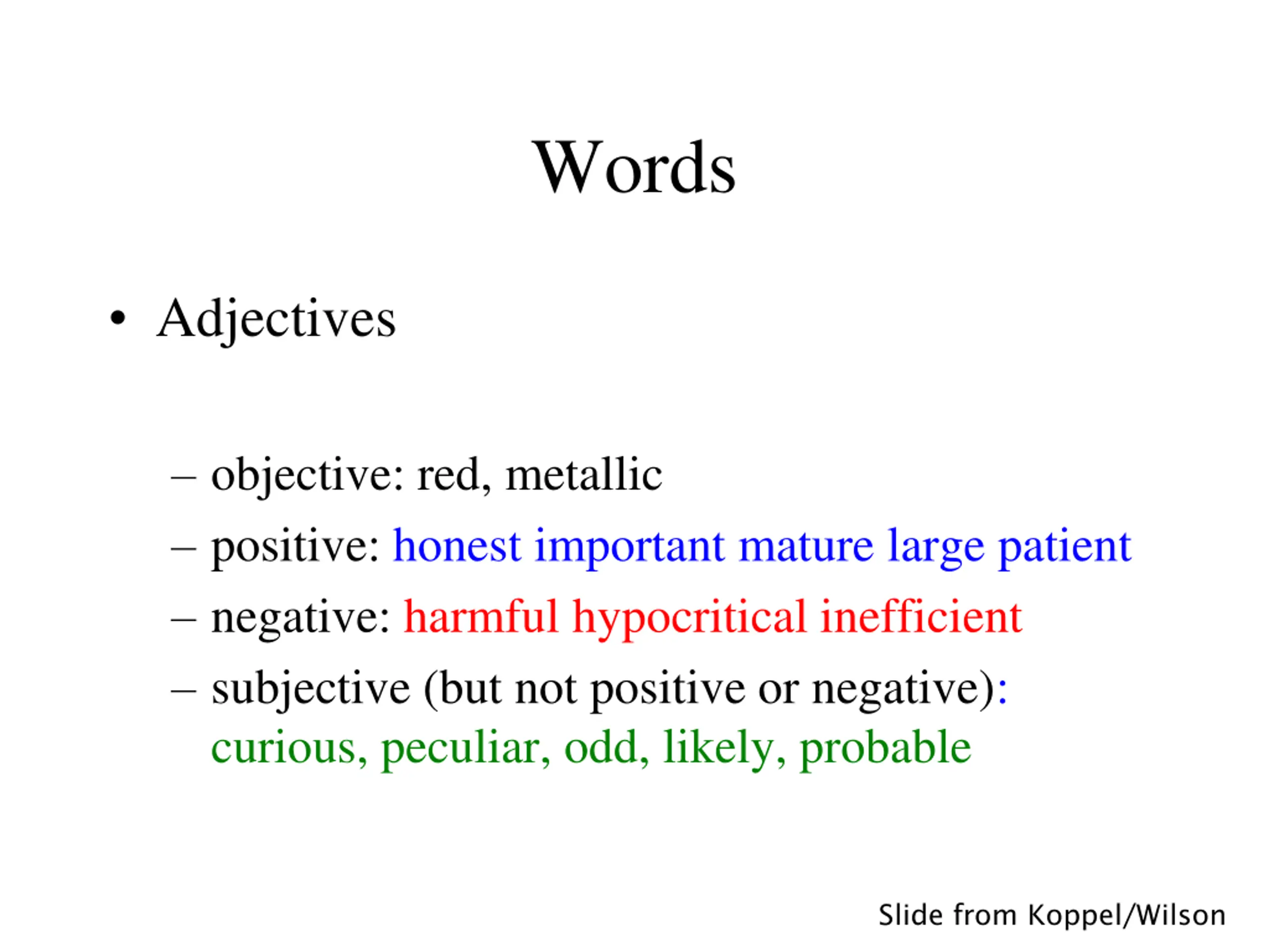 Words Adjectives objective: red, metallic positive: honest important mature large patient negative: harmful hypocritical inefficient subjective (but not positive or negative): curious, peculiar, odd, likely, probable Slide from Koppel/Wilson