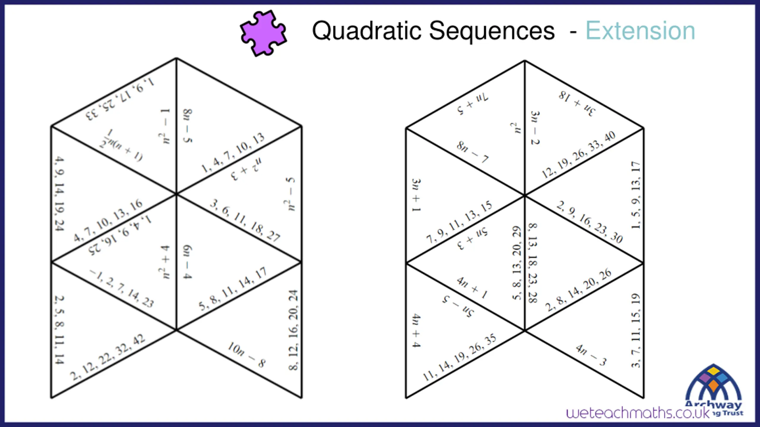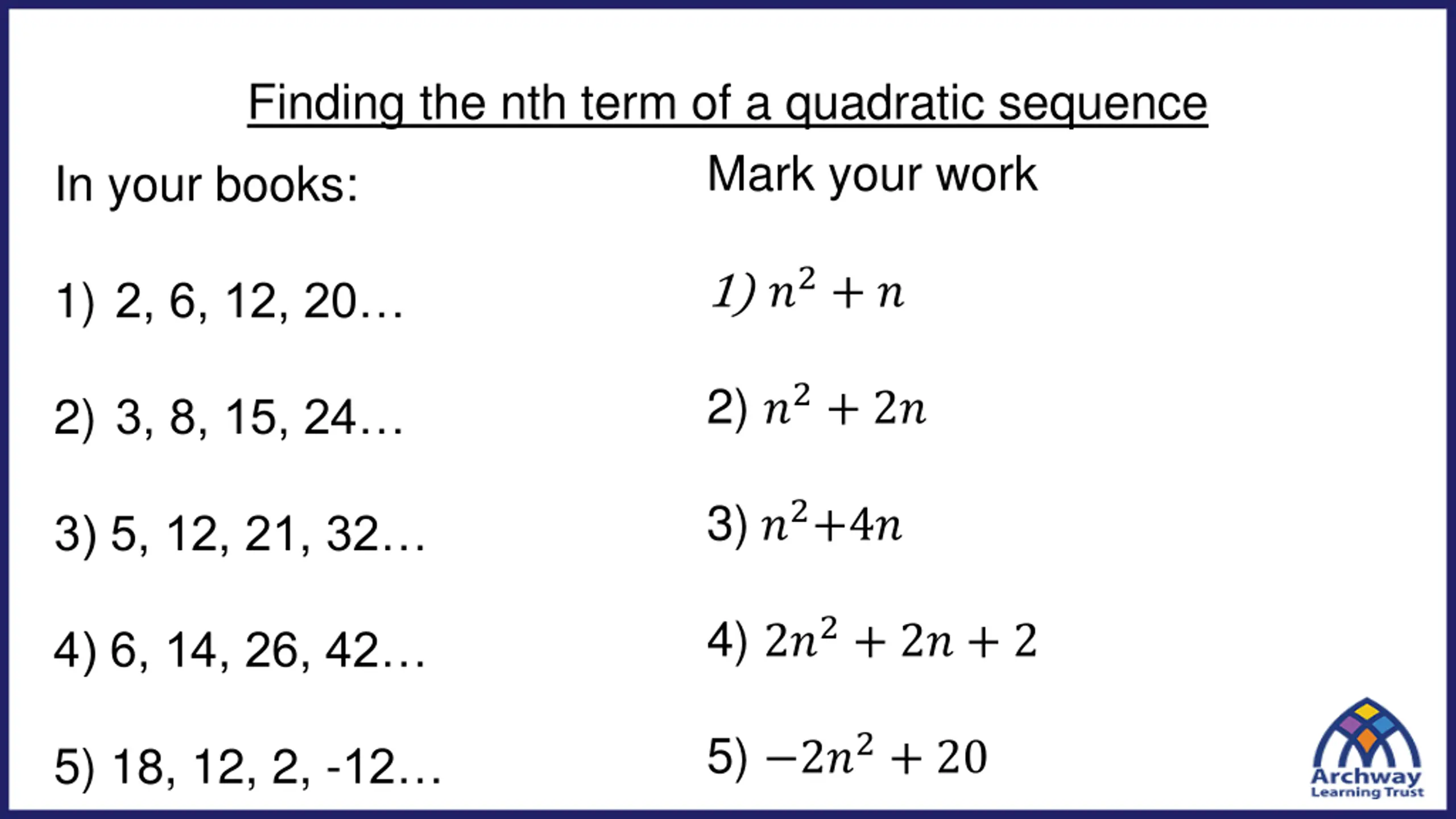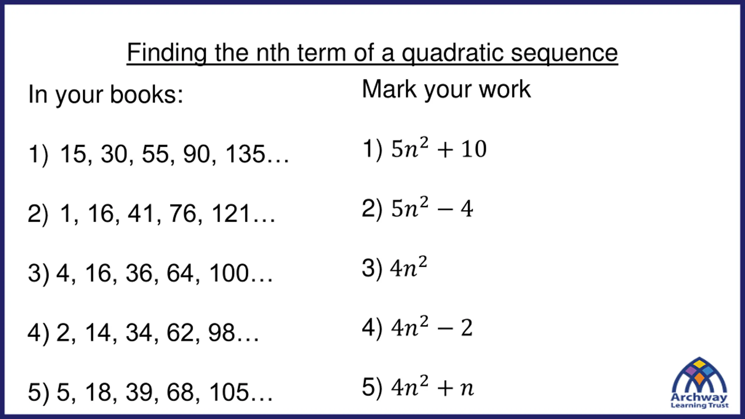 Finding the nth term of a quadratic sequence Mark your work In your books: 1) 5?2+ 10 1) 15, 30, 55, 90, 135 2) 5?2 4 2) 1, 16, 41, 76, 121 3) 4?2 3) 4, 16, 36, 64, 100 4) 4?2 2 4) 2, 14, 34, 62, 98 5) 4?2+ ? 5) 5, 18, 39, 68, 105