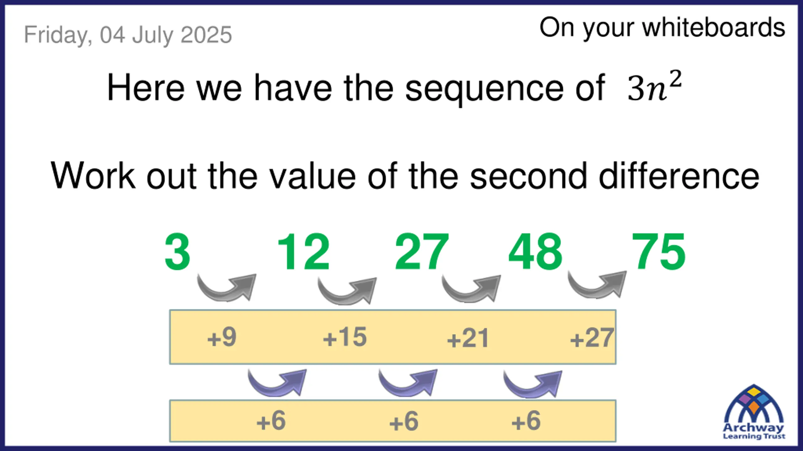 On your whiteboards Friday, 04 July 2025 Here we have the sequence of 3?2 Work out the value of the second difference 48 75 3 27 12 +9 +15 +27 +21 +6 +6 +6