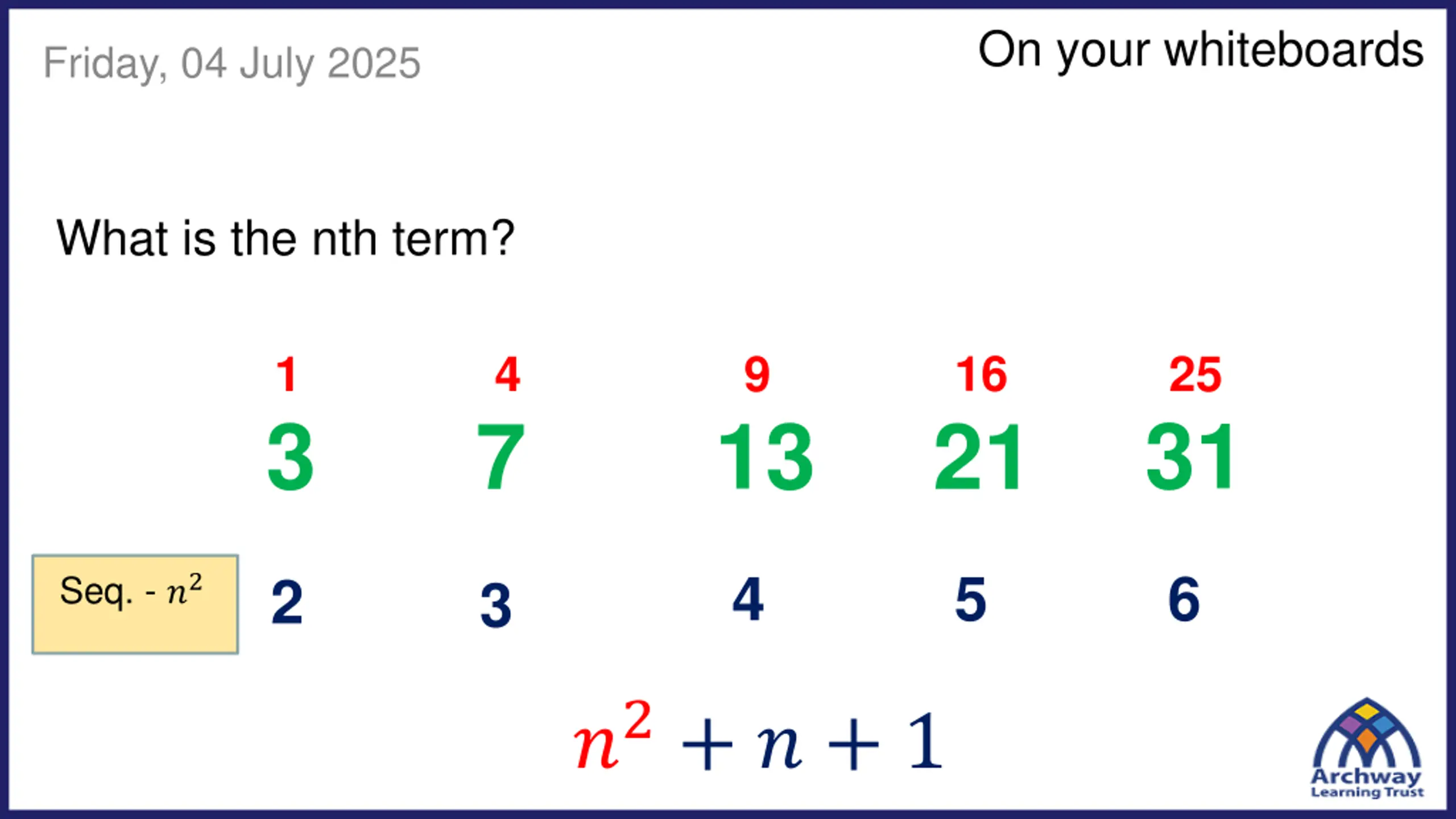 On your whiteboards Friday, 04 July 2025 What is the nth term? 16 1 4 9 25 31 3 13 7 21 4 5 6 2 Seq. - ?2 3 ?2+ ? + 1