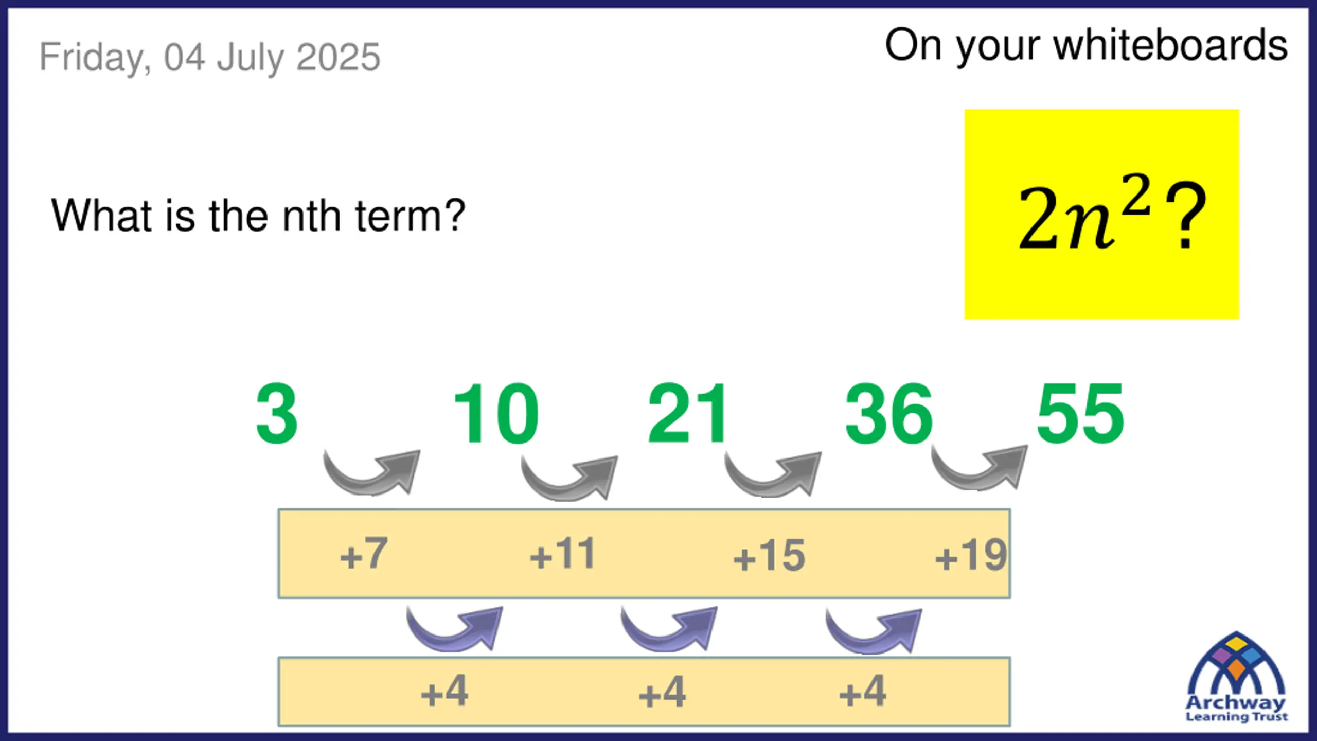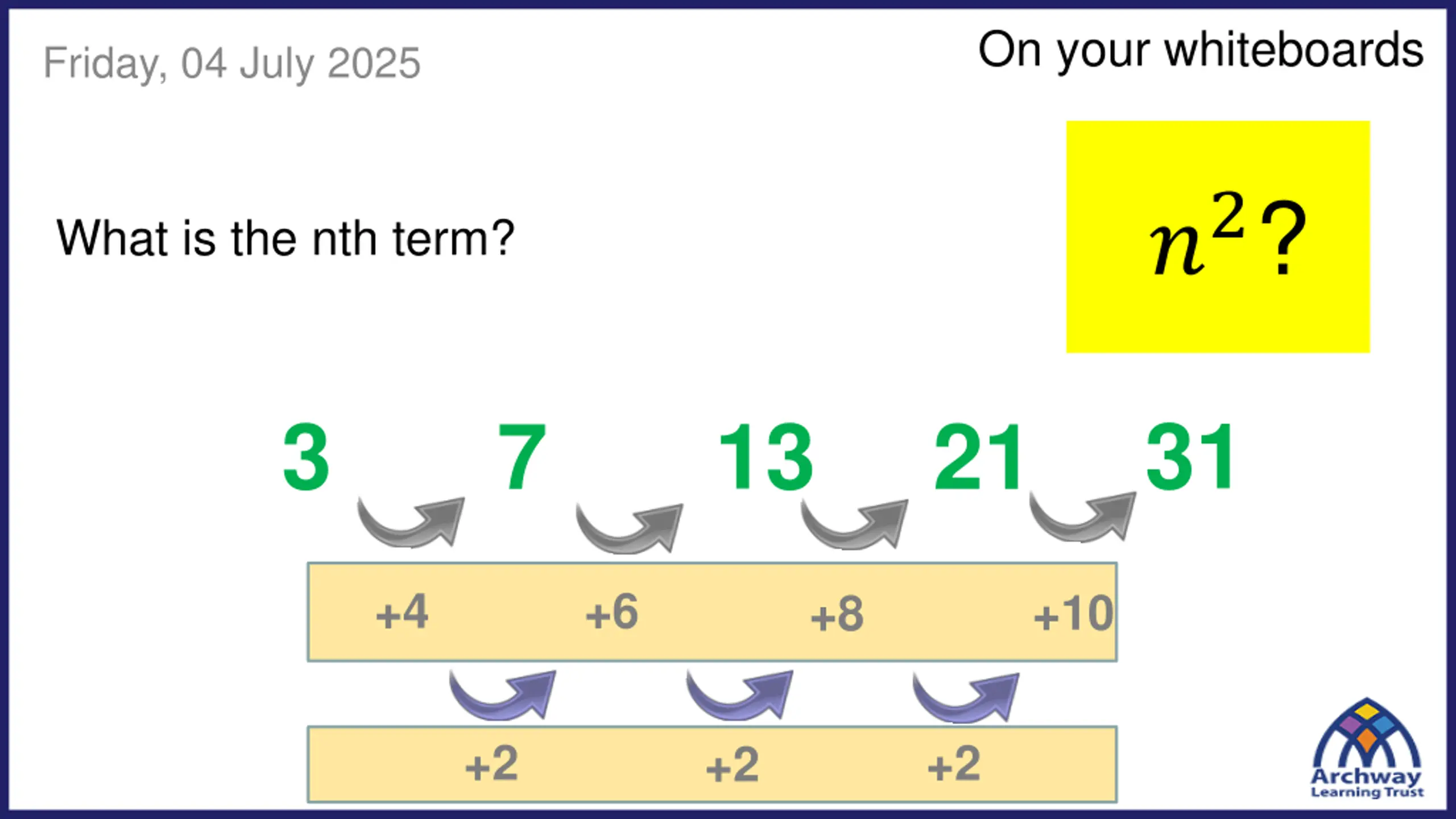 On your whiteboards Friday, 04 July 2025 ?2? What is the nth term? 31 3 13 7 21 +4 +6 +10 +8 +2 +2 +2