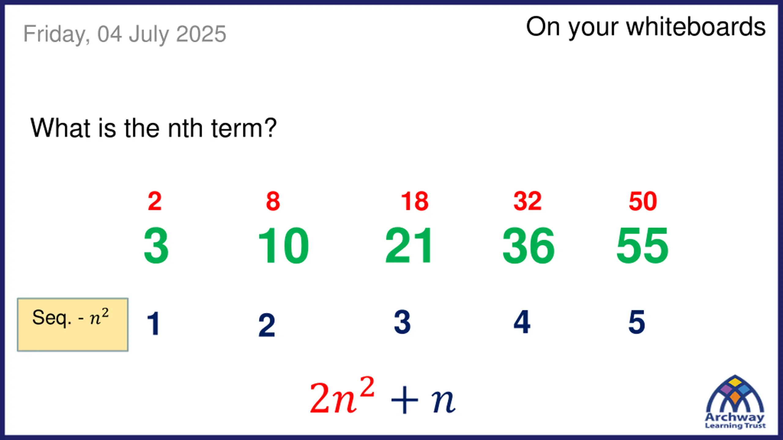 On your whiteboards Friday, 04 July 2025 What is the nth term? 32 2 8 18 50 55 3 21 10 36 3 4 5 1 Seq. - ?2 2 2?2+ ?