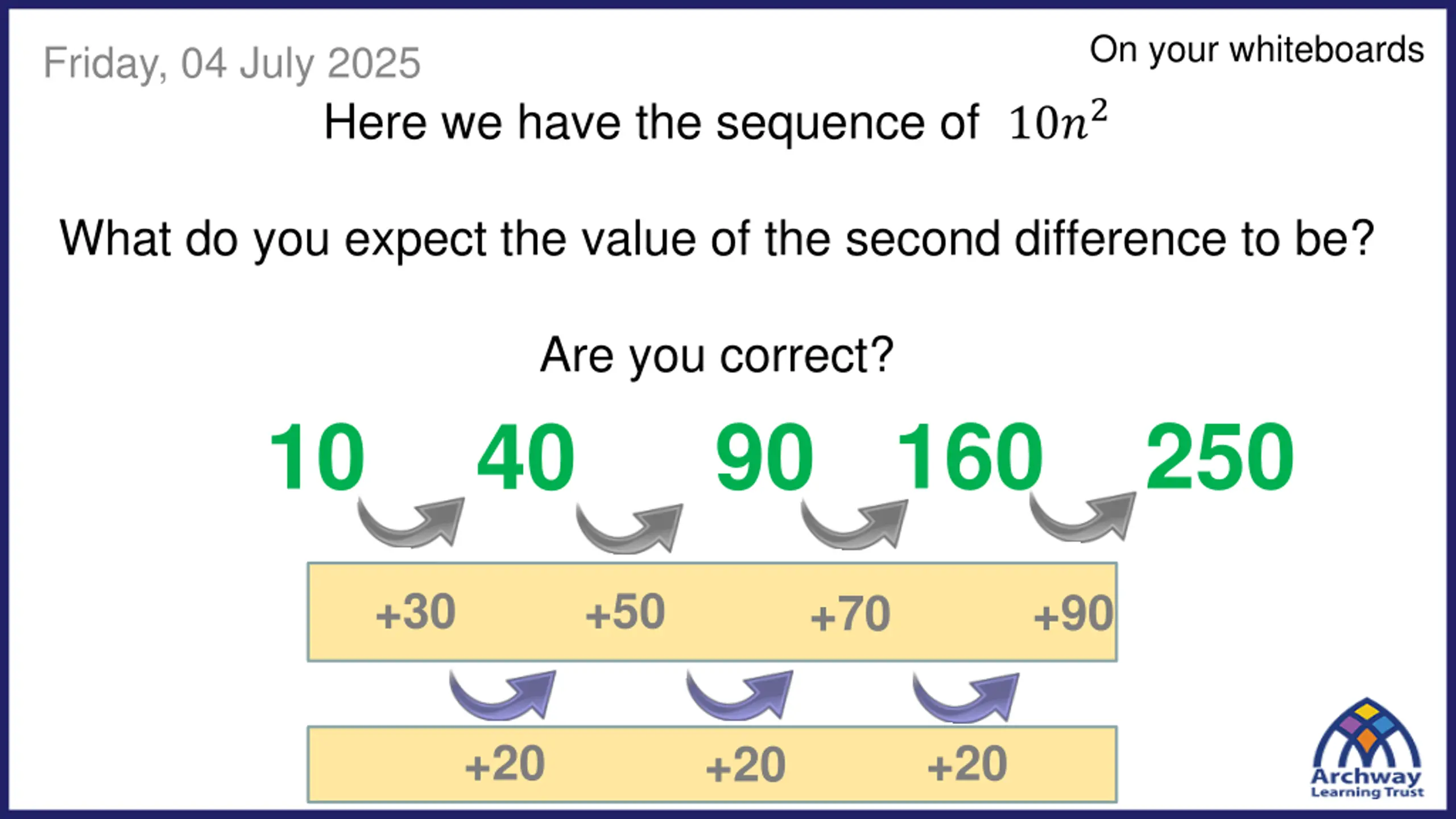 On your whiteboards Friday, 04 July 2025 Here we have the sequence of 10?2 What do you expect the value of the second difference to be? Are you correct? 40 90 160 250 10 +30 +50 +90 +70 +20 +20 +20