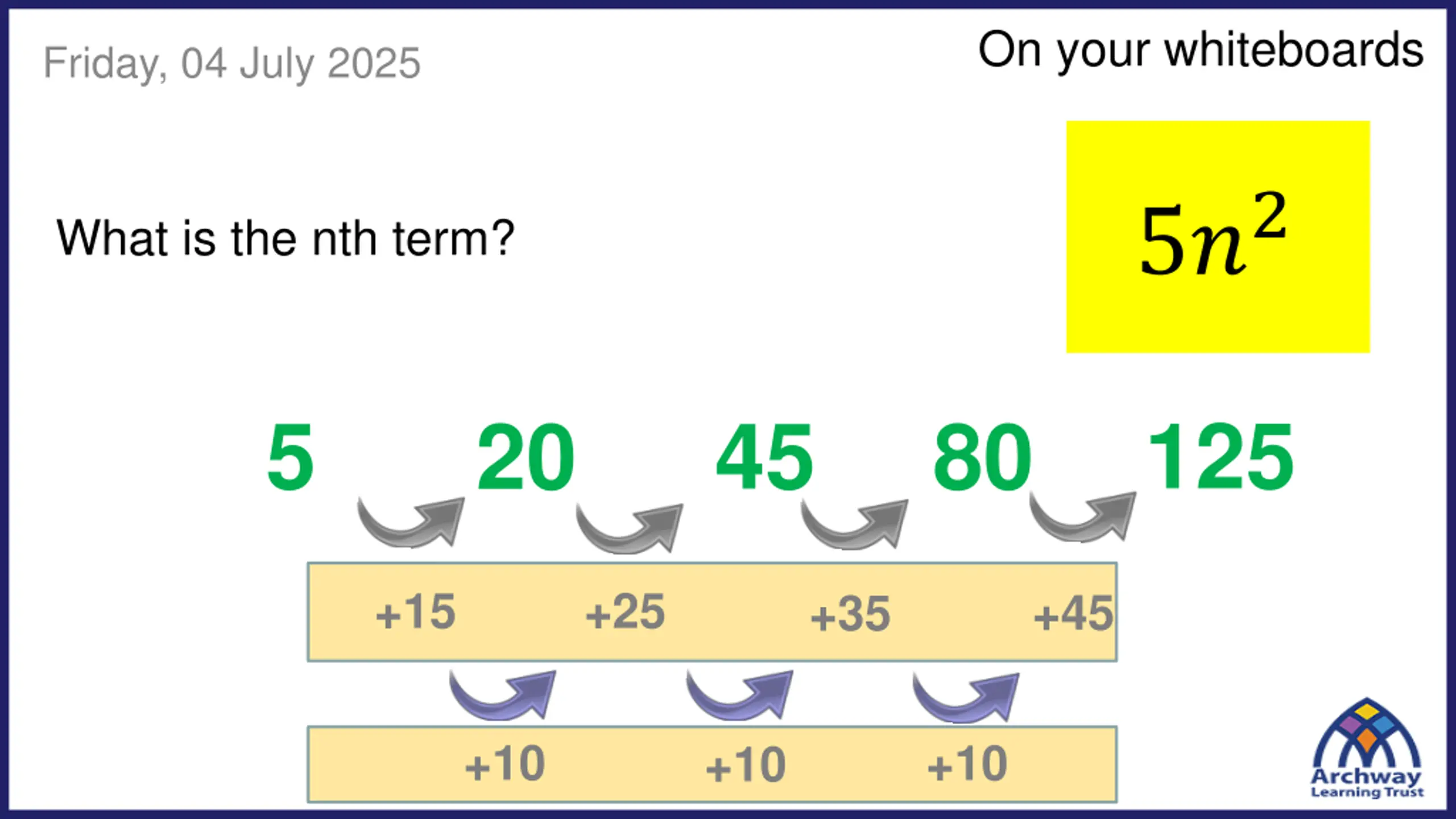On your whiteboards Friday, 04 July 2025 5?2 What is the nth term? 125 5 45 20 80 +15 +25 +45 +35 +10 +10 +10