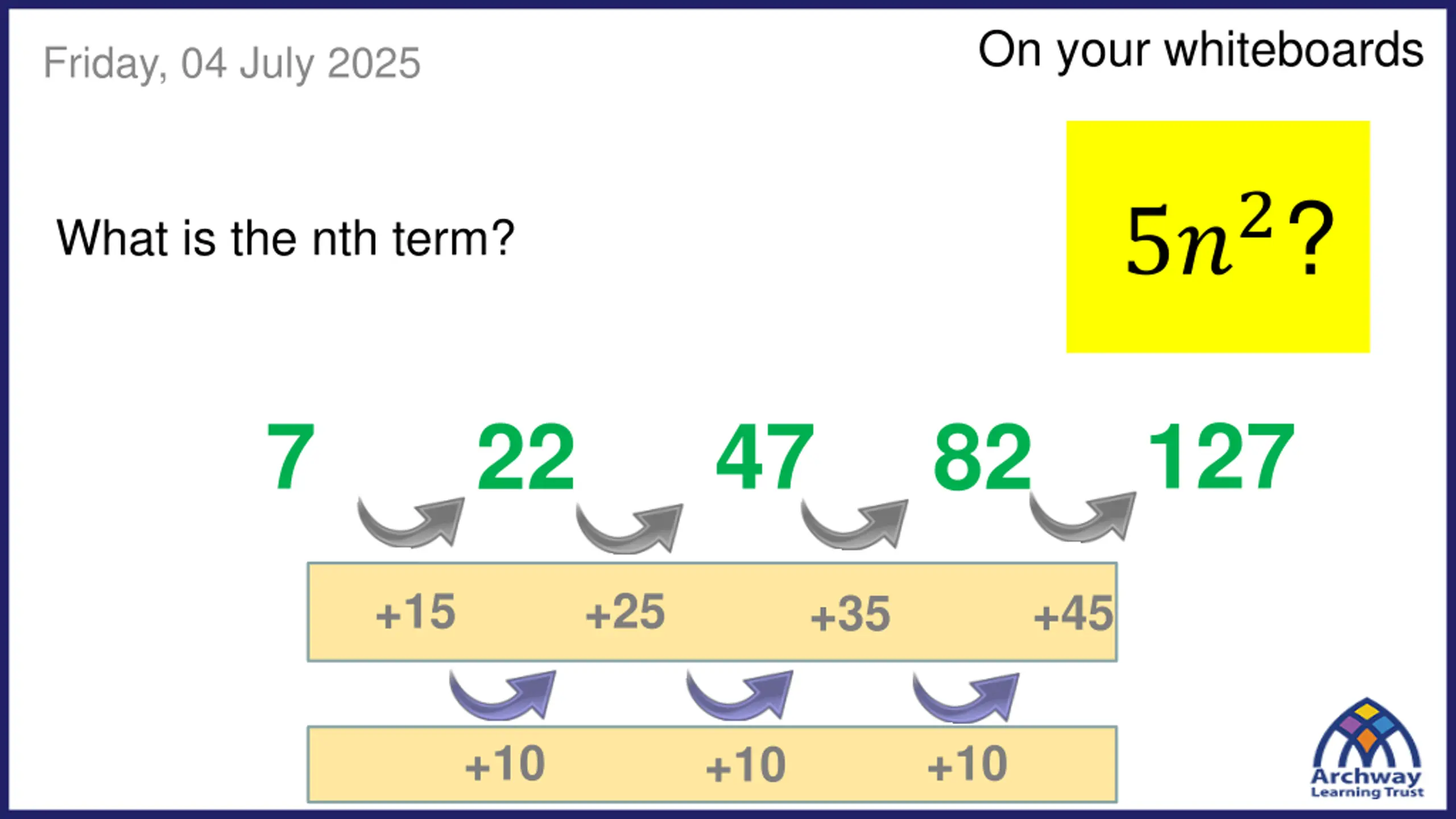 On your whiteboards Friday, 04 July 2025 5?2? What is the nth term? 127 7 47 22 82 +15 +25 +45 +35 +10 +10 +10