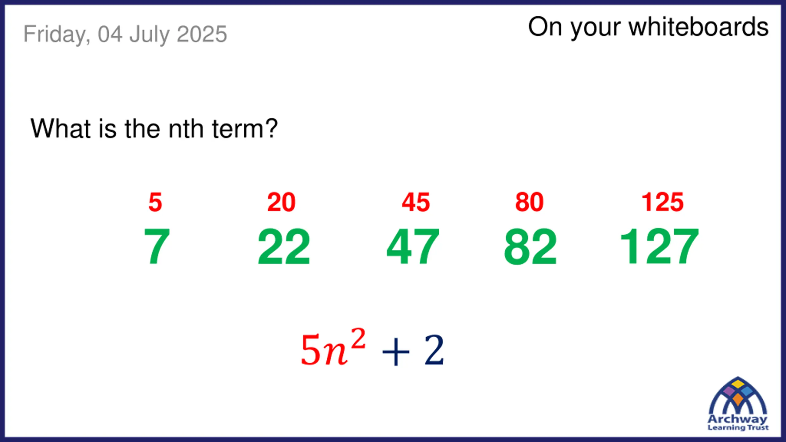 On your whiteboards Friday, 04 July 2025 What is the nth term? 80 125 5 20 45 127 7 47 22 82 5?2+ 2