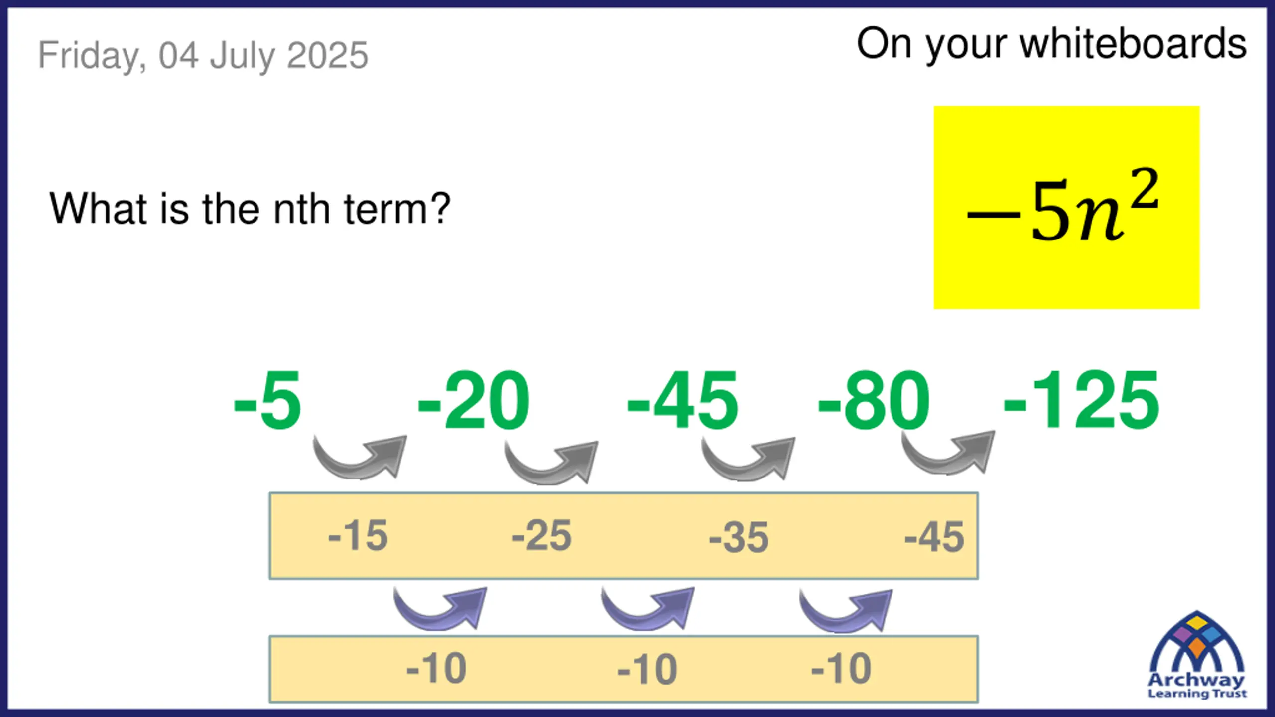 On your whiteboards Friday, 04 July 2025 5?2 What is the nth term? -80 -125 -5 -45 -20 -15 -25 -45 -35 -10 -10 -10